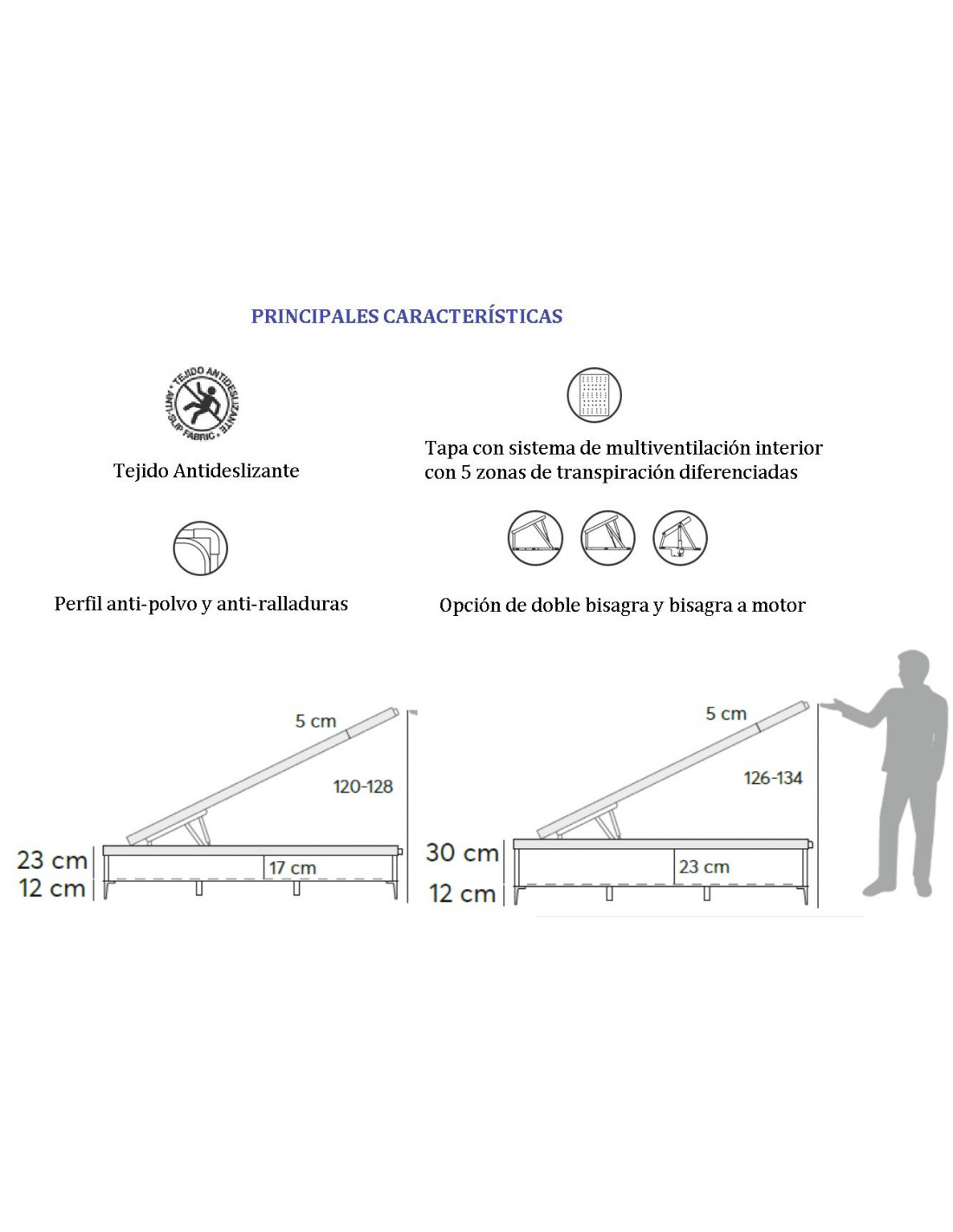 Su base de cajón de 12mm. es resistente y duradera. Además de su capacidad de soporte de peso, este fondo aporta un extra de firmeza al conjunto ya que viene atornillada a todo el contorno. Al suelo lleva un perfil de silicona antipolvo que evita que se acumule suciedad; opcionalmente se le puede cambiar este perfil por bases deslizantes para facilitar la movilidad del canapé sobre el suelo.