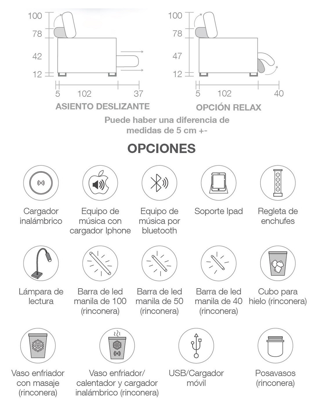 Dispone de diferentes configuraciones de medidas gracias a que es un sofá modular, pudiendo hacer sofás de varias plazas, chaiselongue, rinconeras e incluso sillones relax del mismo modelo.