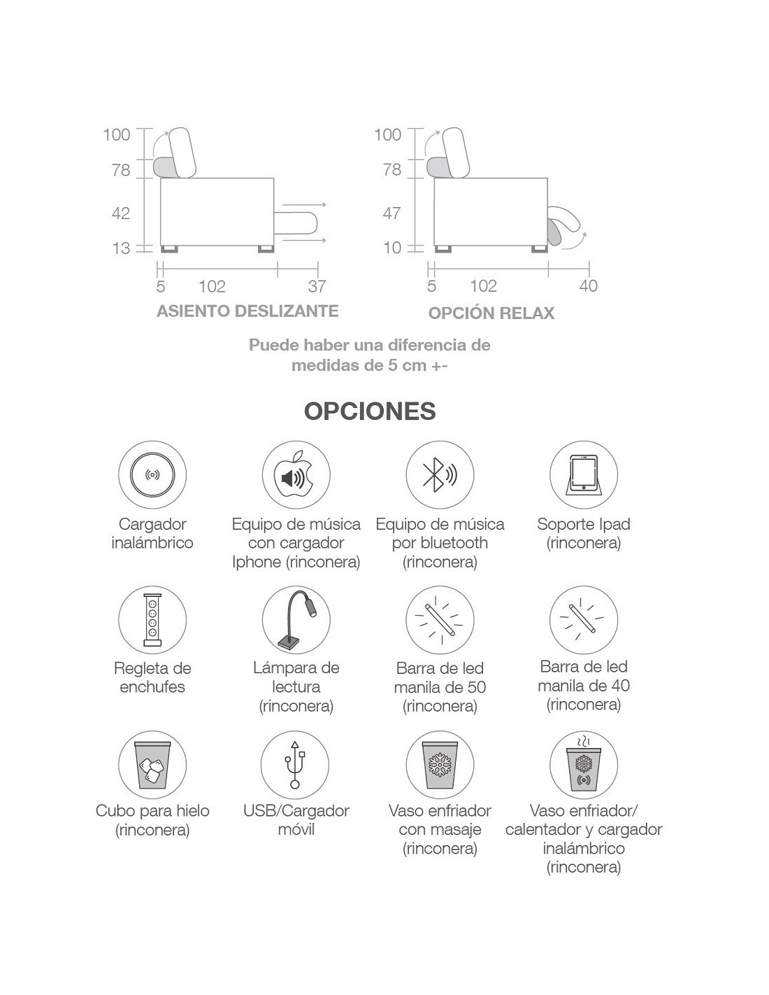 Dispone de diferentes configuraciones de medidas gracias a que es un sofá modular, pudiendo hacer sofás de varias plazas, chaiselongue, rinconeras e incluso sillones relax del mismo modelo.