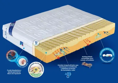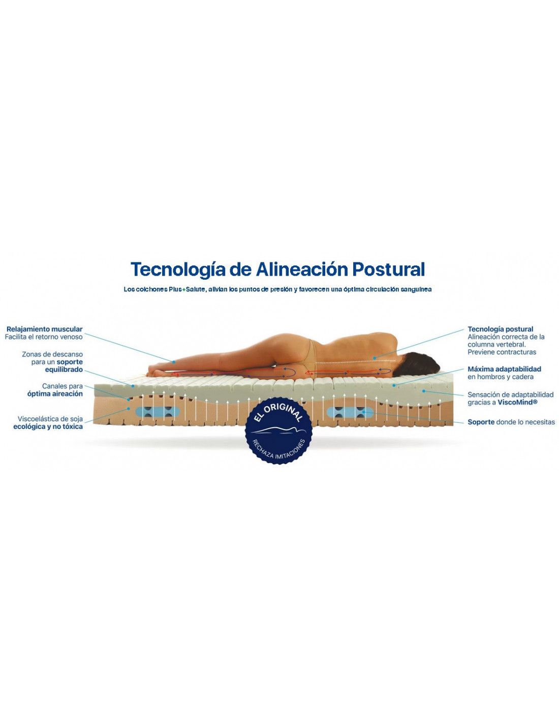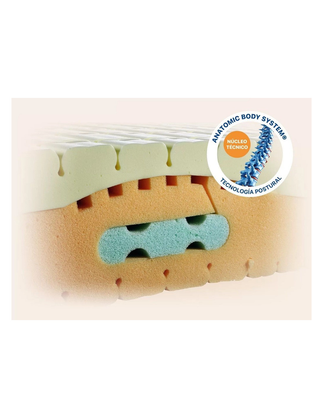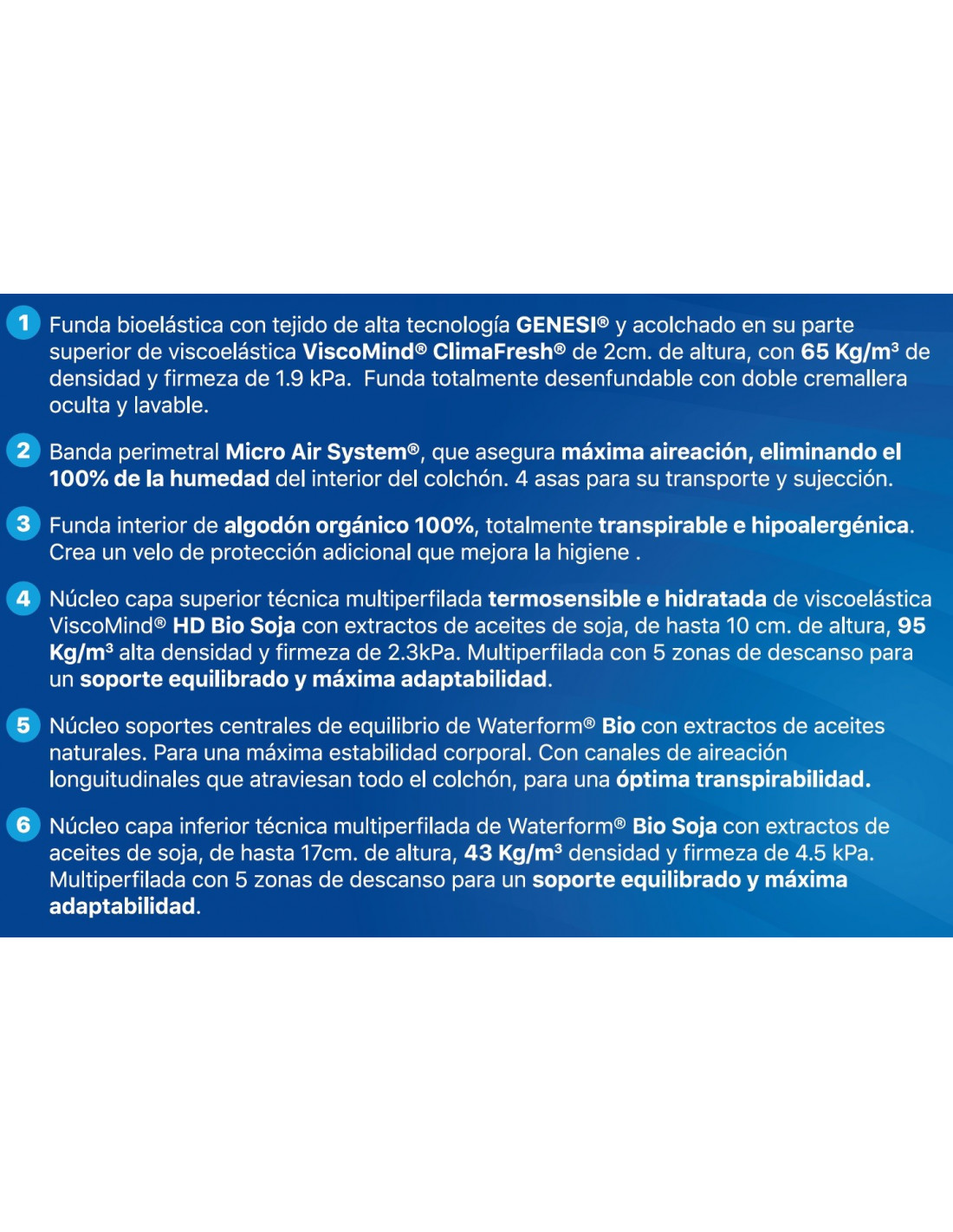 Compuesto por viscoelástica inteligente de soja multiperforada y transpirable, que tiene una estructura abierta que evacúa rápidamente la humedad, permitiendo un fresco descanso. Con un proceso de producción ecológico, la viscoelástica termosensible de Bio Soja, aporta más elasticidad y una nueva sensación de hidratación y frescor.