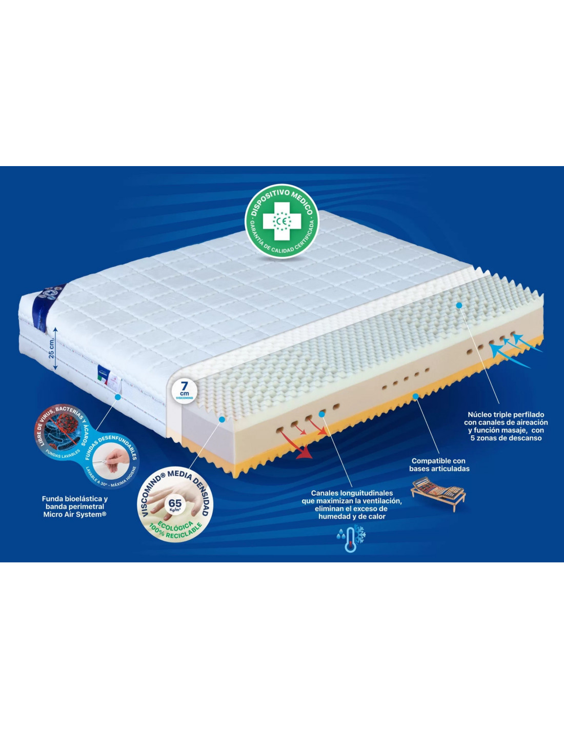 Además cuenta en su acolchado de la parte superior con una capa de viscoelástica ViscoMind® de 2cm. de altura, con 65 Kg/m³ de densidad. Funda totalmente desenfundable con doble cremallera oculta, lavable a 30º. Altura total 25 cm.