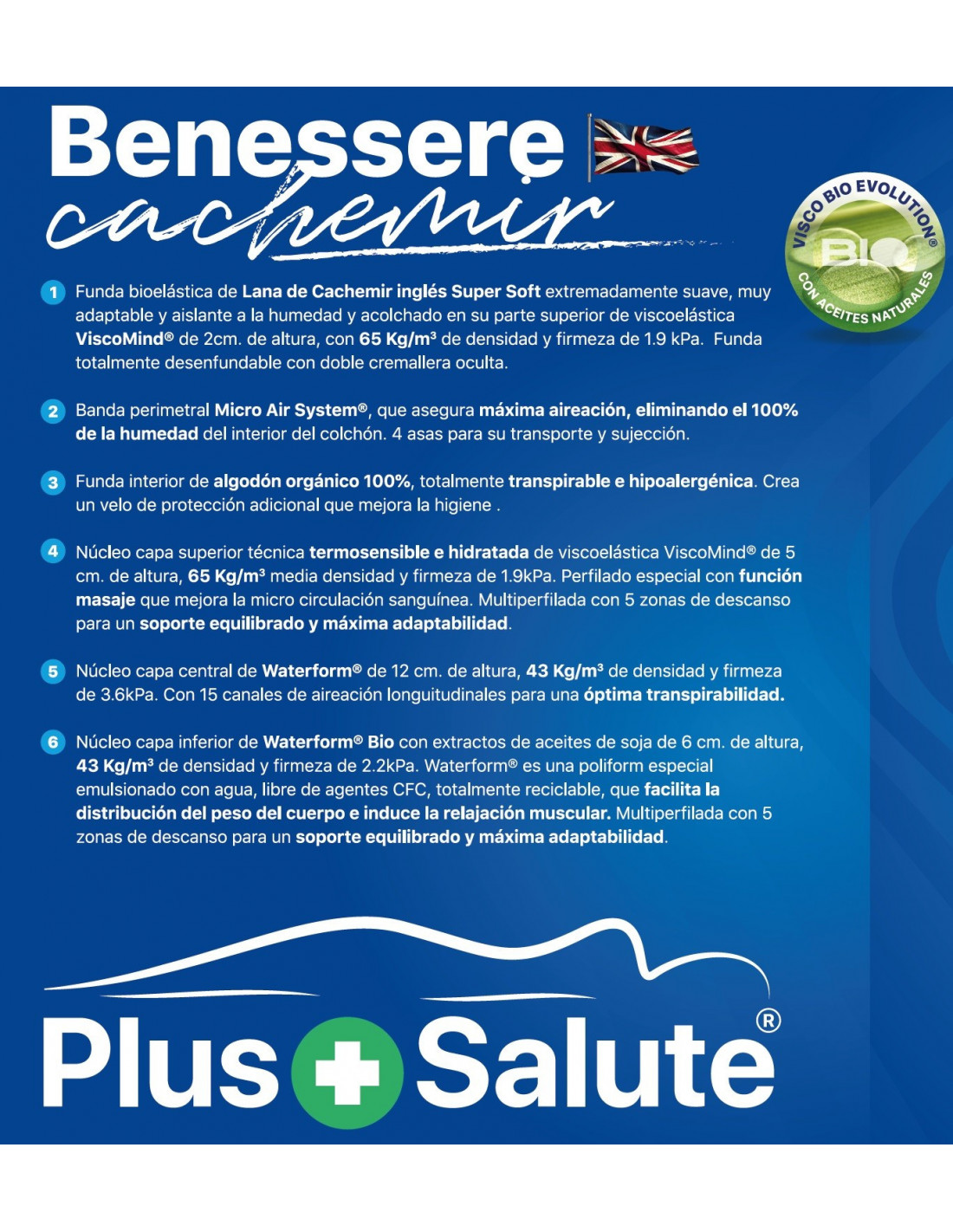 En su exterior cuenta con la suavidad única de su funda bioelástica de Lana de Cachemir inglés Super Soft extremadamente suave, muy adaptable y aislante a la humedad. Esta lana de lujo de cachemir inglés extremadamente suave y muy adaptable, actúa como aislante natural gracias a que tiene una alta capacidad de absorción de la humedad y de regulación de la temperatura. La sensación sobre nuestro cuerpo es cálida en invierno y fresca en verano (aislante).