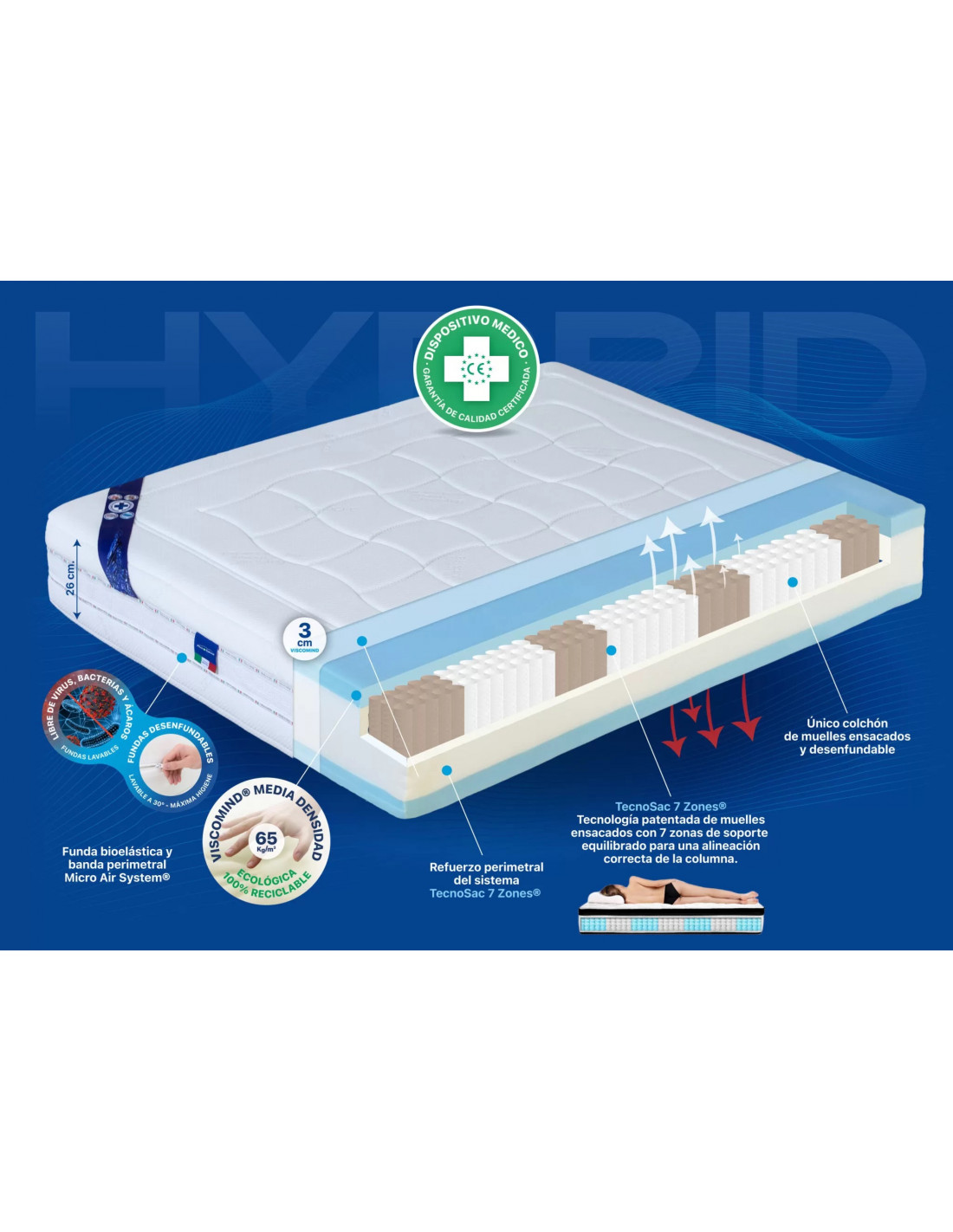 - Núcleo de muelles ensacados TecnoSac 7 Zones® (1.500 muelles en cama doble / 900 muelles en cama simple) de 14 cm. de altura, distribuidos en 7 zonas de descanso, mediante muelles con alambres de diferente diámetro.
