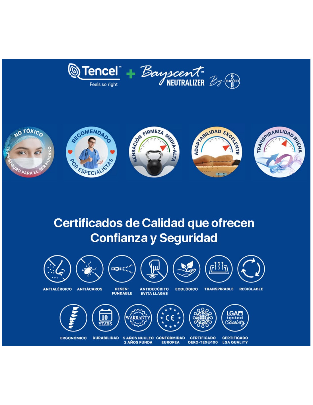 Funda bioelástica con tejido de alta tecnología TENCEL™ y acolchado en su parte superior de viscoelástica ViscoMind® de 2cm. de altura, con 65 Kg/m³ de densidad y firmeza de 1.9 kPa. Hilo de plata antimicrobiano. Funda totalmente desenfundable con doble cremallera oculta y lavable. La funda Tencel™ es más absorbente que el algodón, más suave que la seda y mejor que el lino. Neutraliza los malos olores gracias al tratamiento Bayscent™.