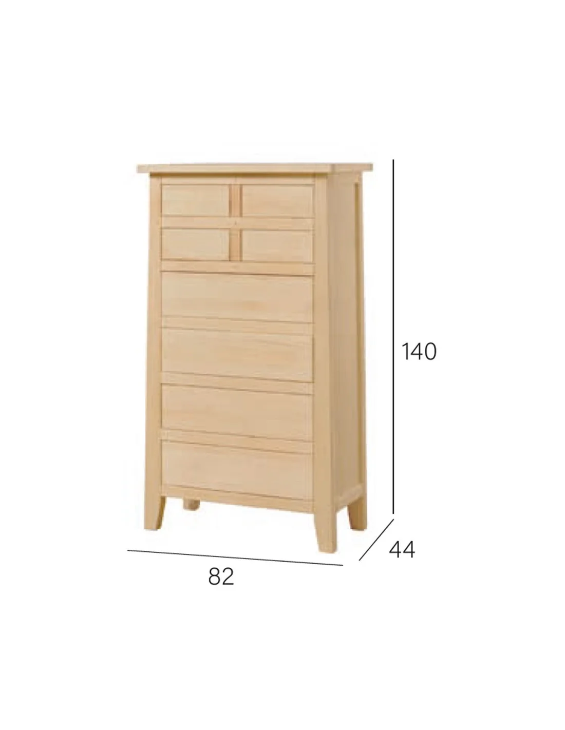 Esta Sinfonier Rustika de ocho cajones tiene las siguientes medidas: altura 140 cm. fondo 44 cm. y largo 82 cm.