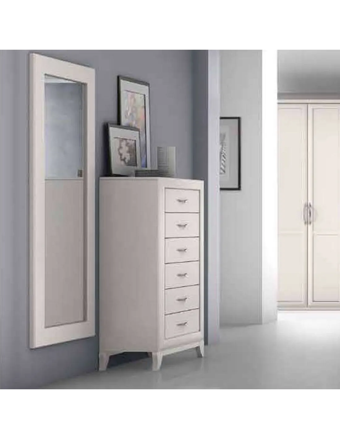 El diseño clásico se resume en esta serie de muebles. Este gran sinfonier con patas tiene una linea clásica de siempre con remates técnicos actualizados de gran calidad, como las guías de los cajones o los moldurones lacados a juego. Además, nos permite elegir color y elegir opcionalmente el mural espejo de grandes dimensiones a juego con el sinfonier.