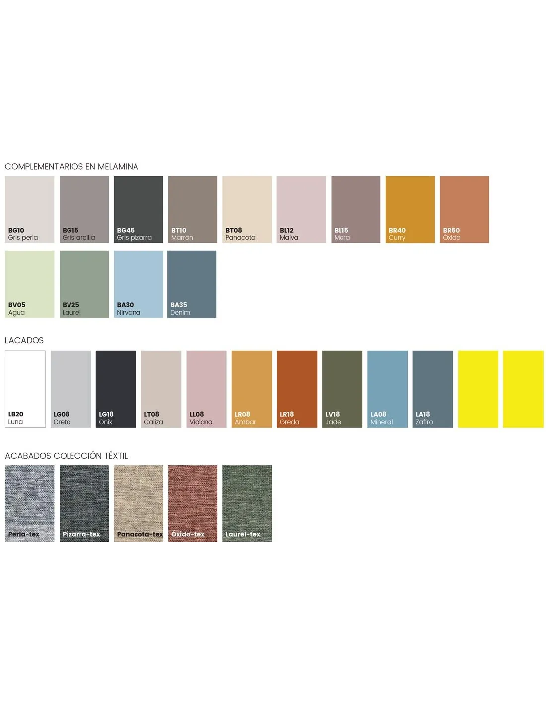 - Colores base: para aplicar obligatoriamente en los cascos-estructuras de los muebles, y de manera opcional en los frentes de cajón-puertas.