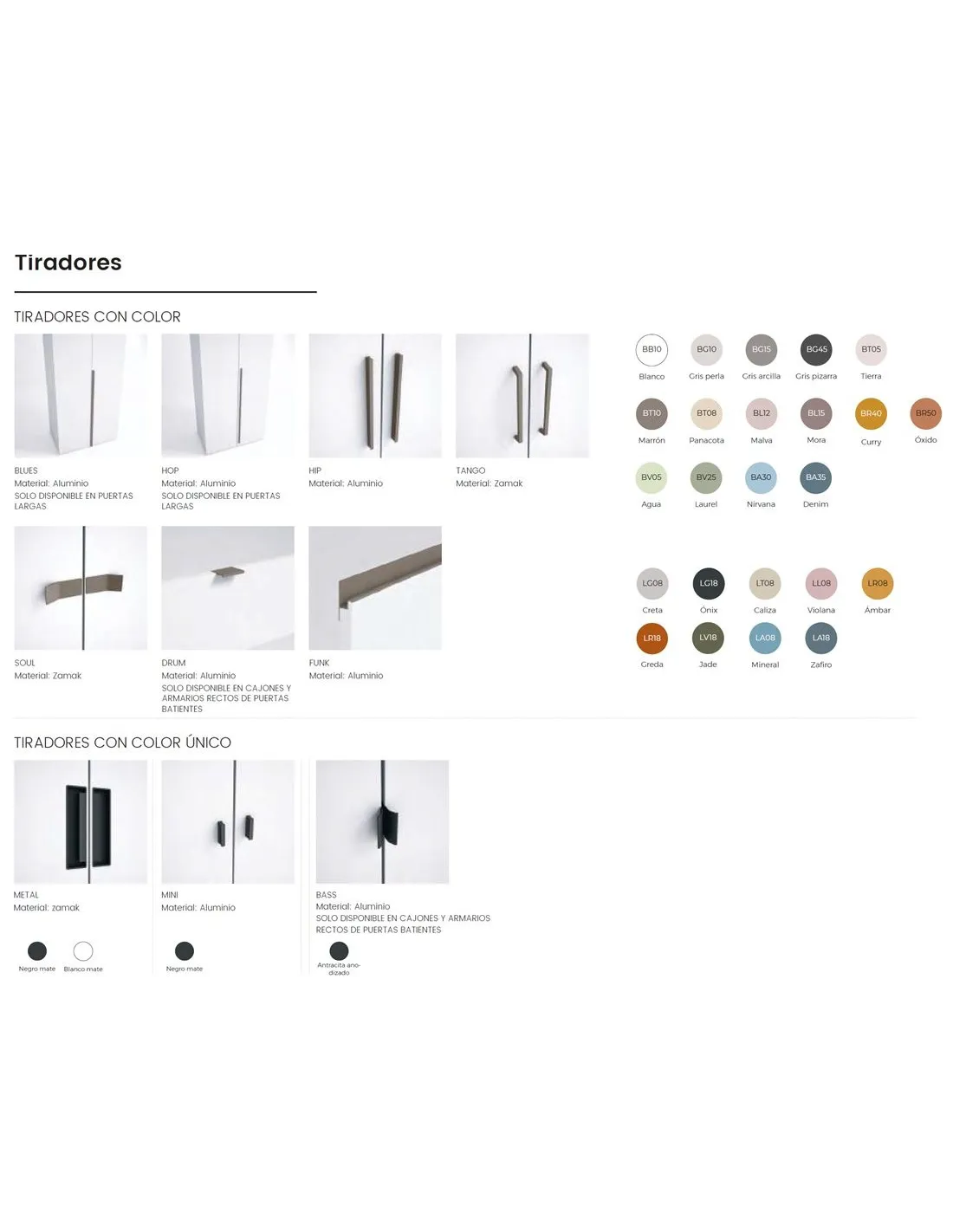 - Tiradores: por defecto se envía el modelo que aparece en la foto principal. Se le puede poner cualquier de los modelos cortos disponibles sin cargo, para los módulos que así lo requieran (excepto en mesitas apertura push o gap).
