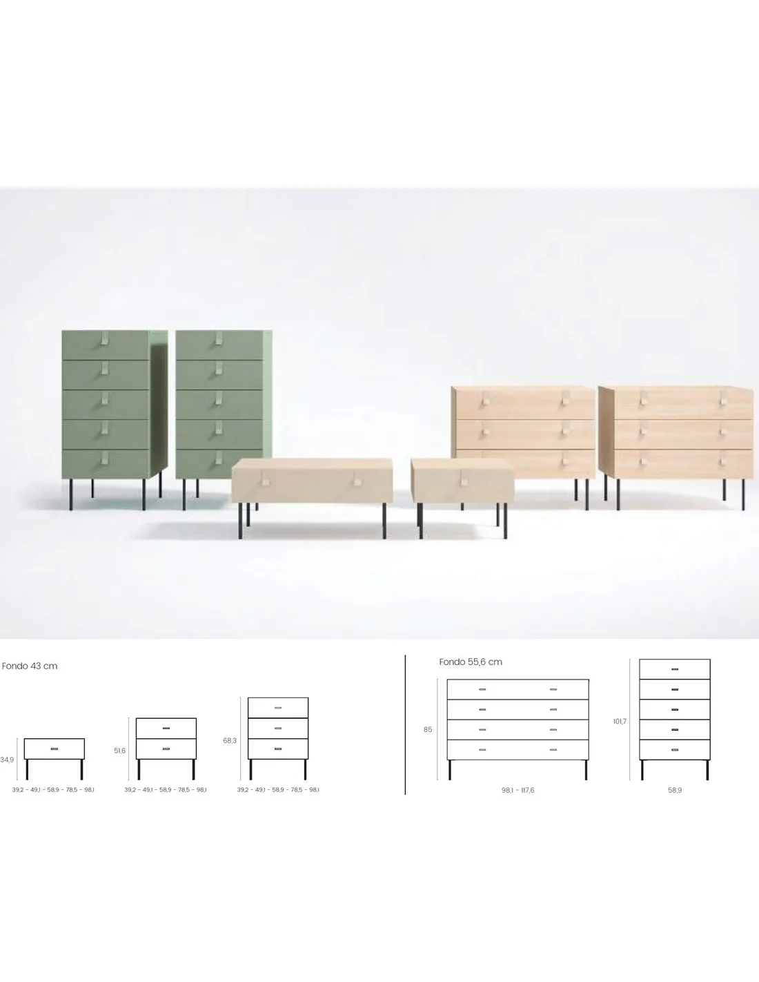 Esta composición Minimal de Ros incluye una serie de mobiliario variable en medida y acabados, que en el caso concreto de esta ficha de producto incluye los muebles con las siguientes medidas: