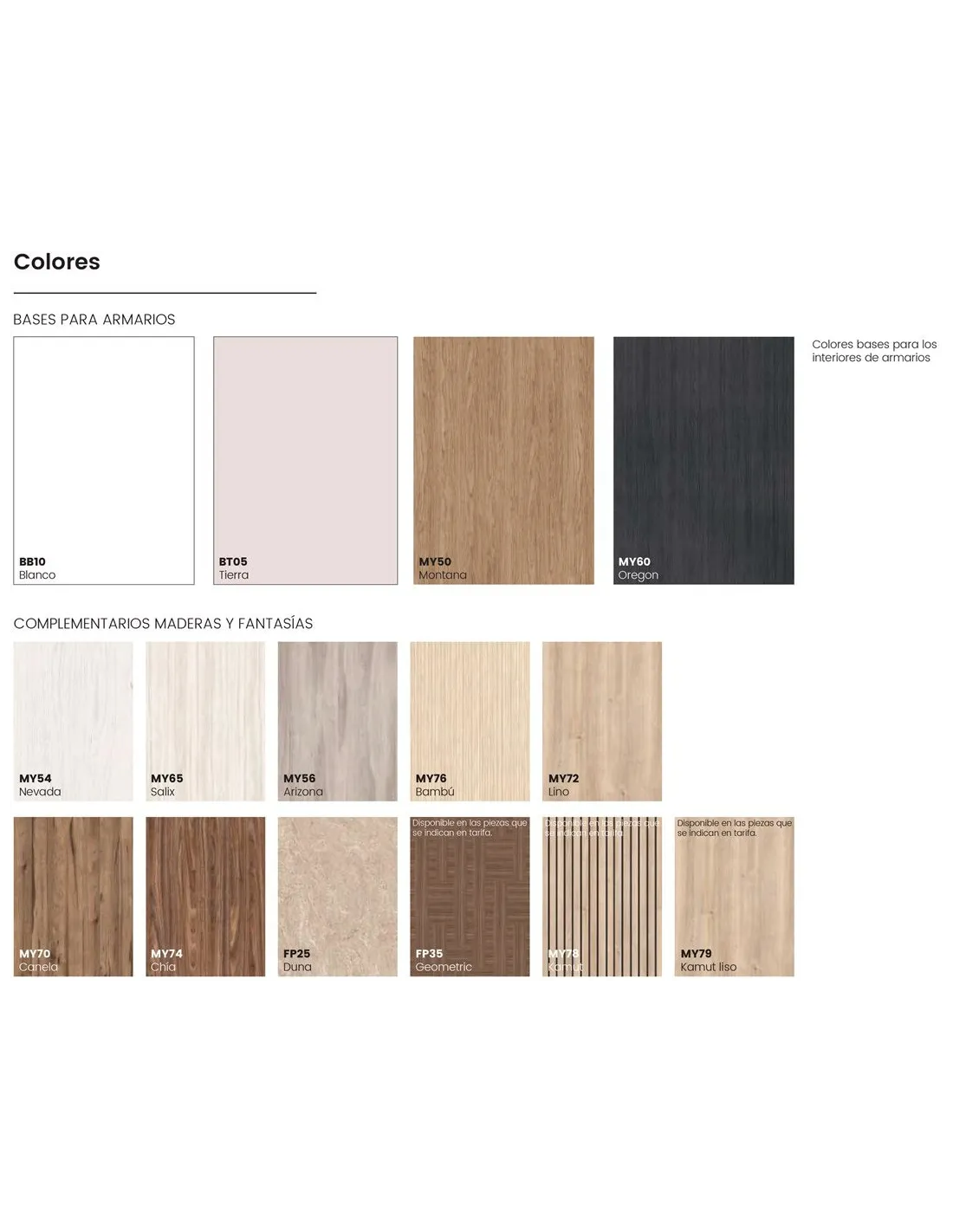 - Colores base: para aplicar obligatoriamente en los cascos-estructuras de los muebles, y de manera opcional en los frentes de cajón-puertas.