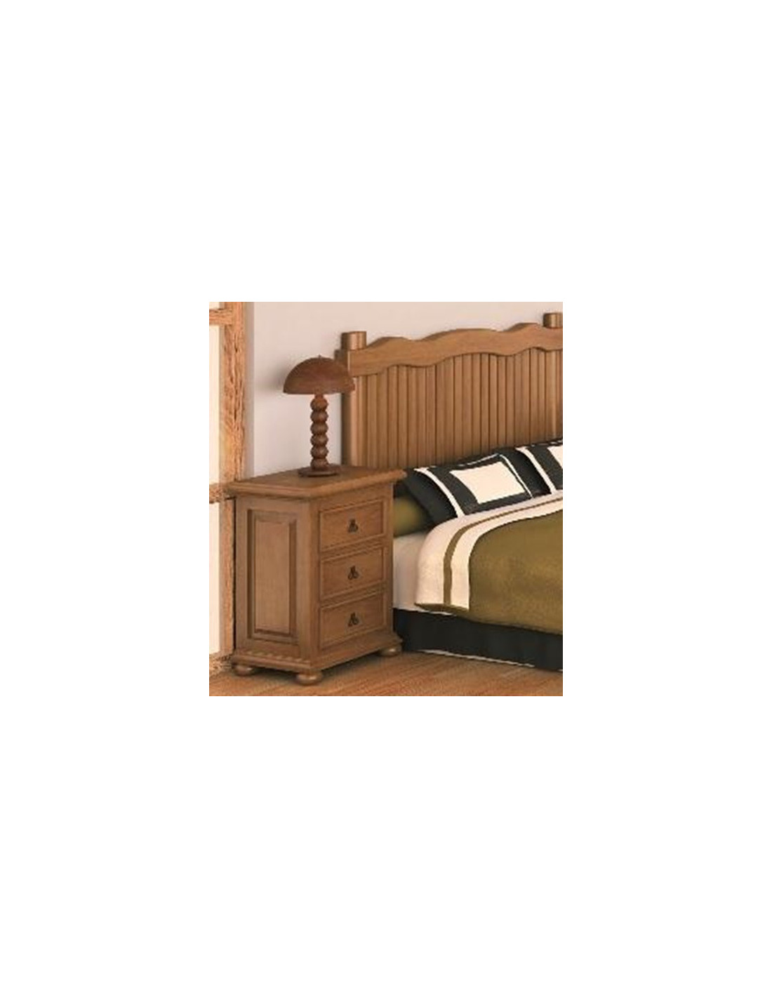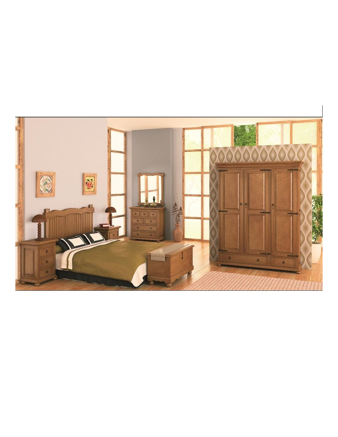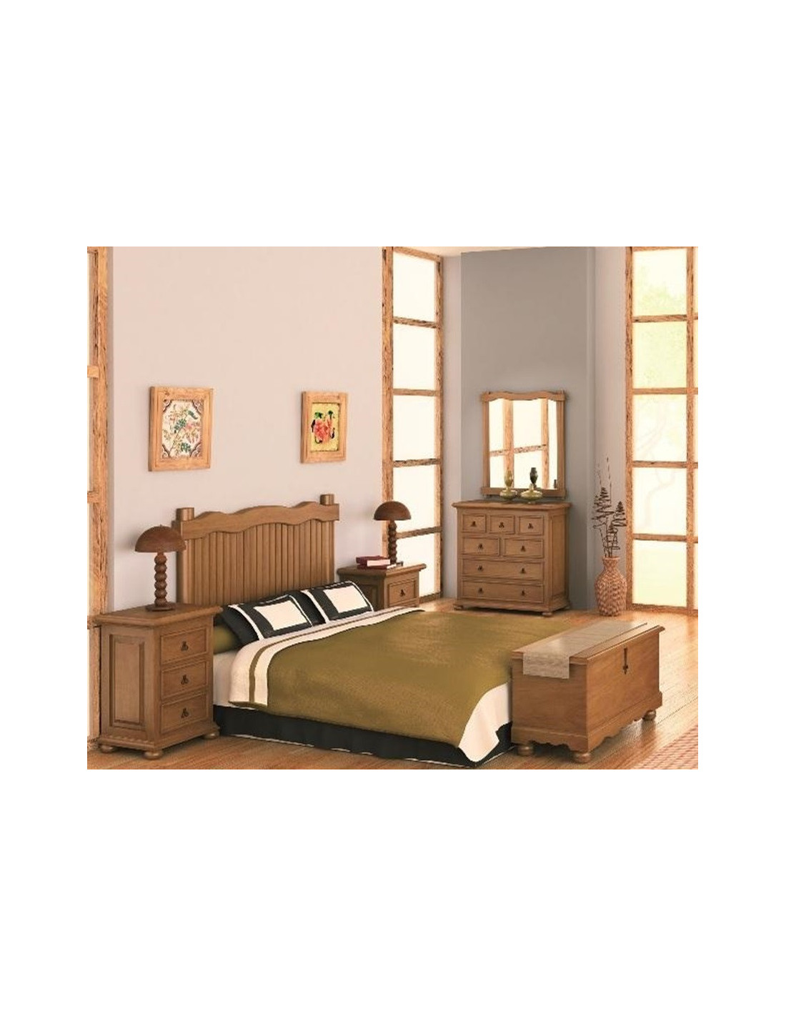 Muebles de dormitorio de matrimonio en madera de pino de estilo mexicano con mesita de 3 cajones.