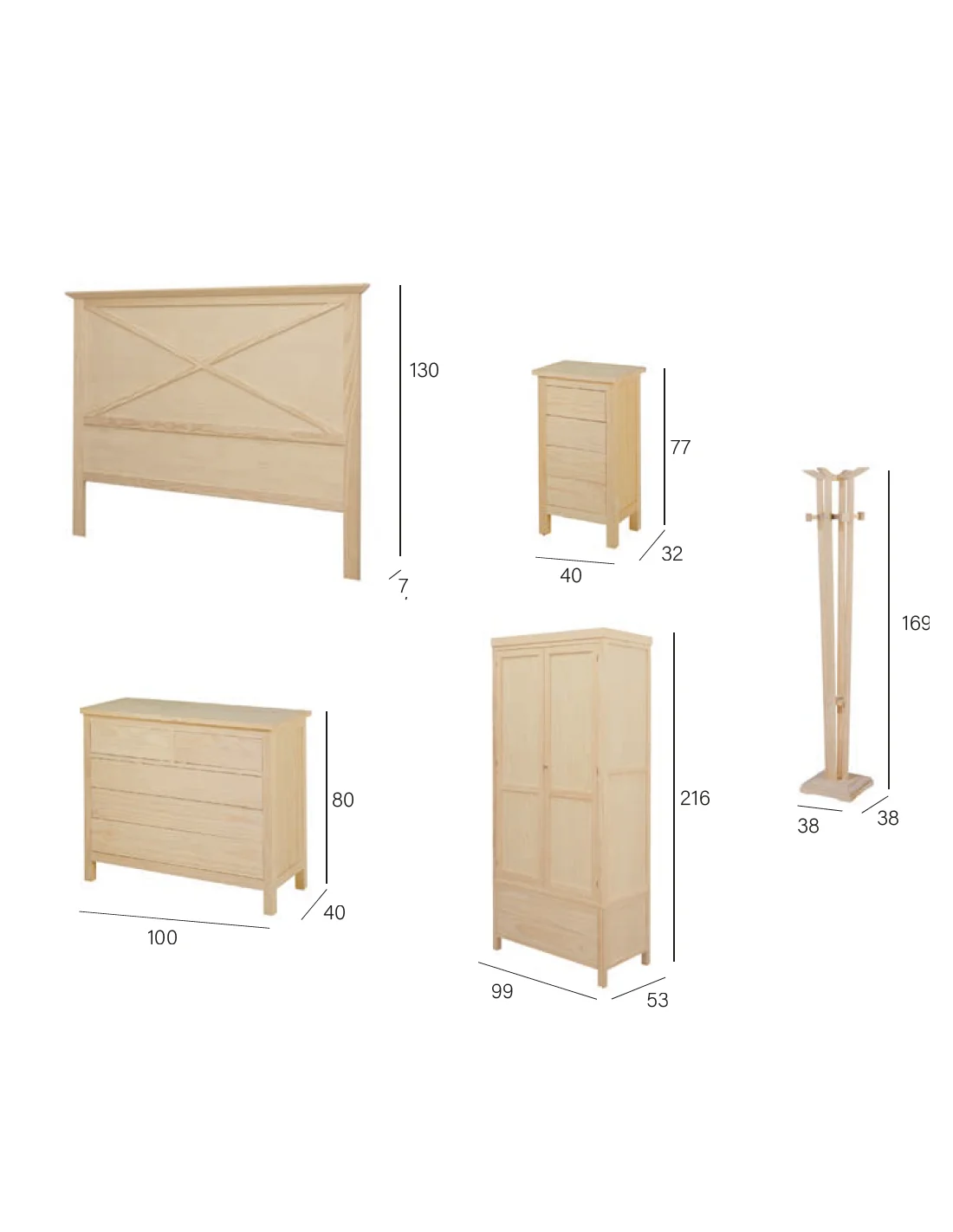 Este dormitorio rústico colonial de madera tiene las siguientes piezas con las medidas detalladas en largo x alto x fondo (cm.):
