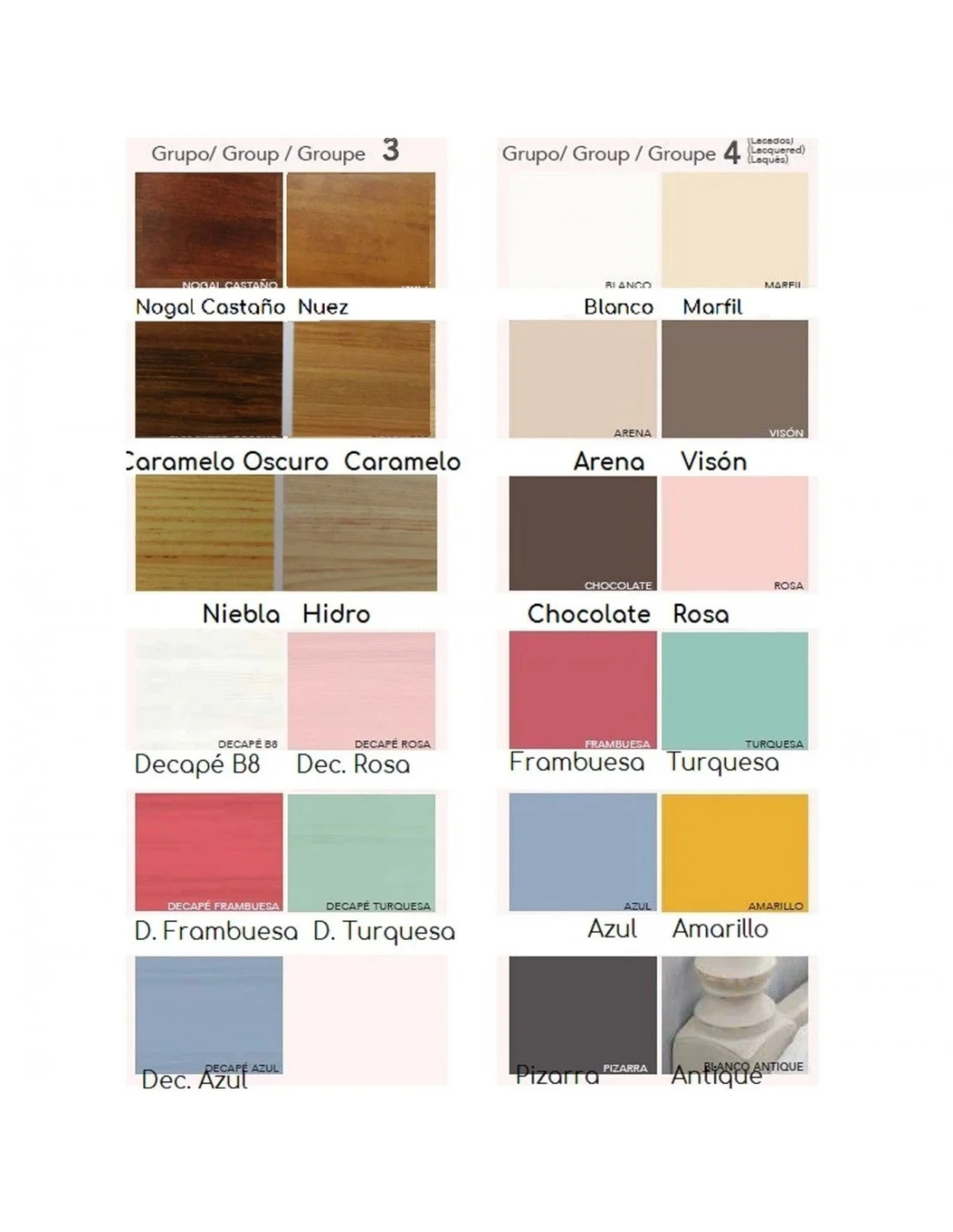 Acabados barnizados y decapés con varias posibilidades a elegir, y otros acabados colores de la colección de acabados lacados con un pequeño incremento de precio. Se pueden combinar dos o más acabados para el mismo mueble. También se puede escoger entre varios modelos de tirador al mismo precio.
