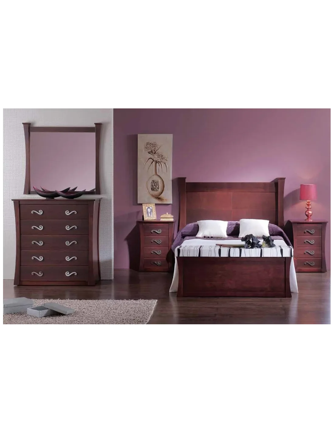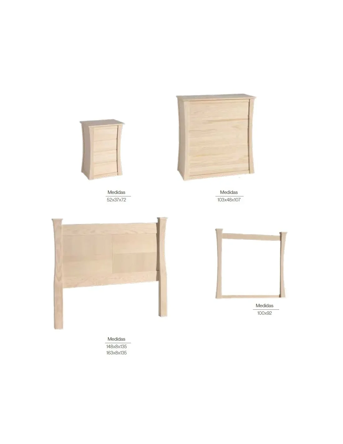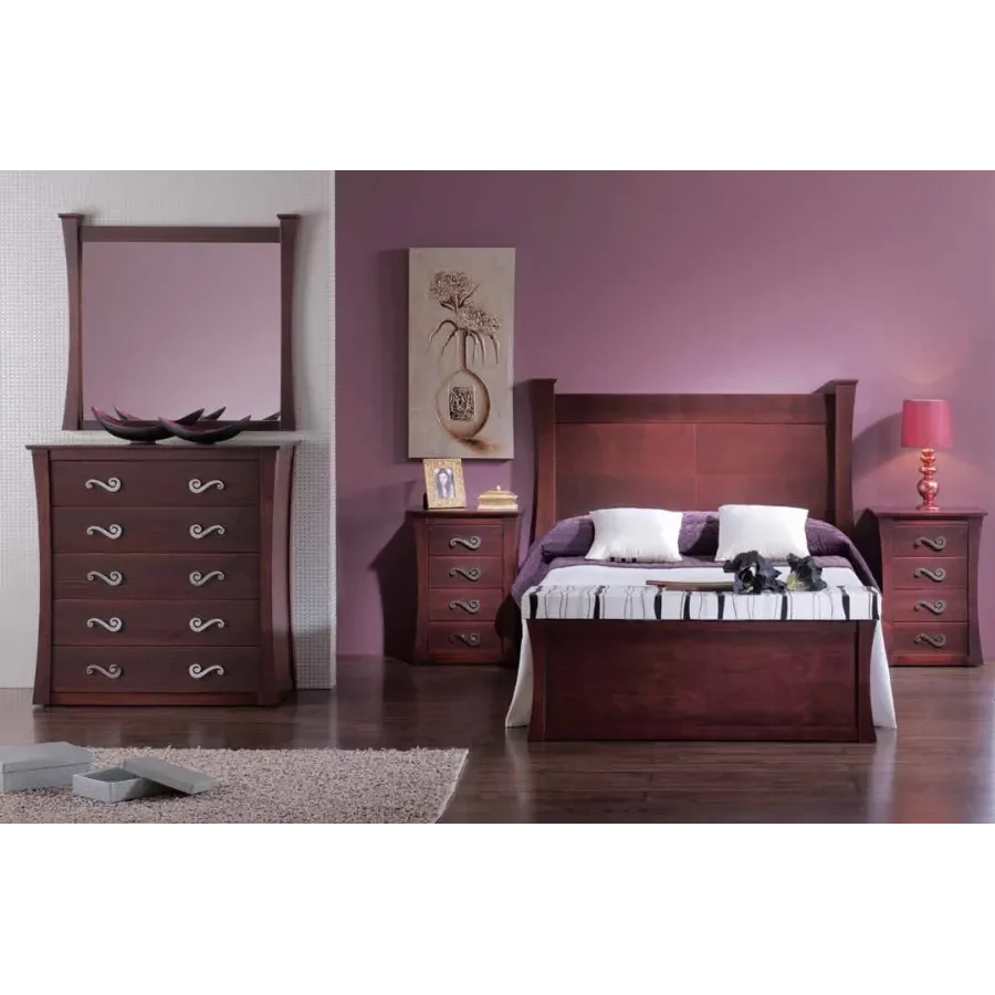 Muebles de dormitorio hechos en madera de pino con amplia variedad de acabados disponibles. Muebles con diseño de lineas curvas e inspiración clásica con aires renovados para un dormitorio con personalidad y estilo.