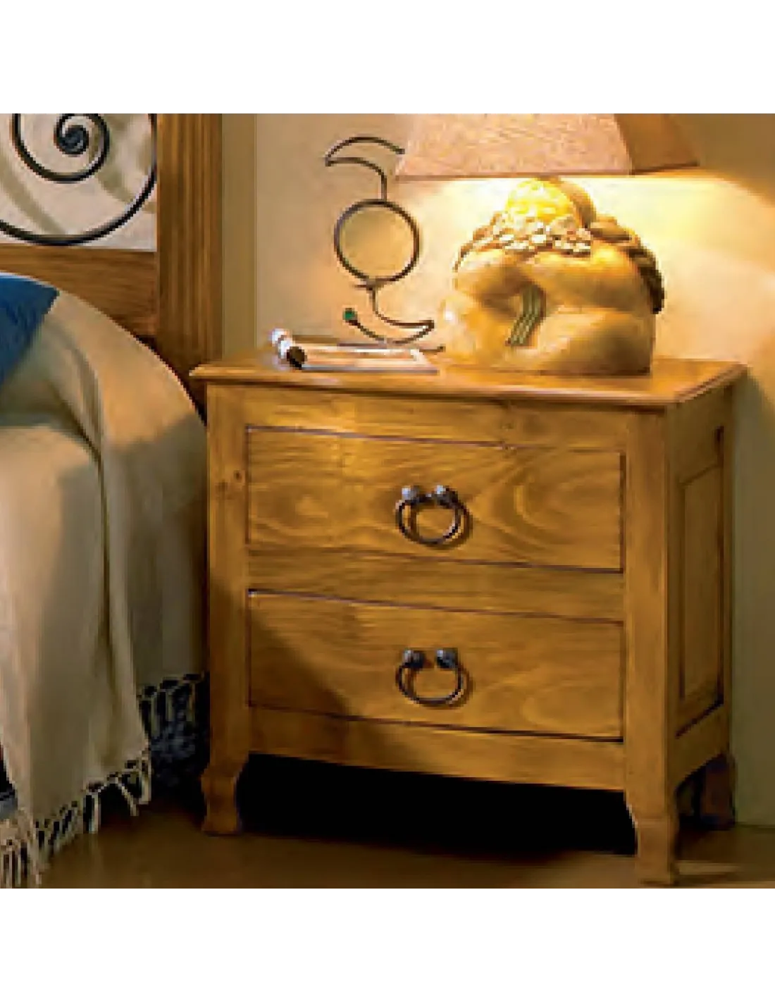 Mueble de dormitorio fabricado a mano por carpinteros y ebanistas, de fabricación andaluza, usando solo materias primas de origen nacional. Dormitorio completo de matrimonio compuesto por dos mesitas de noche de dos cajones, cabecero de cama, cómoda cuatro cajones y espejo.