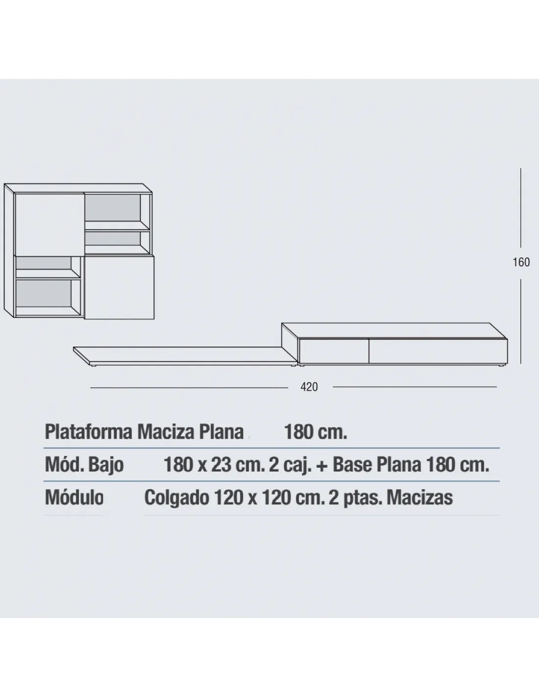 Este mueble salón de diseño tiene las siguientes medidas (alto x largo x fondo en cm.): 160 x 420 x 45.