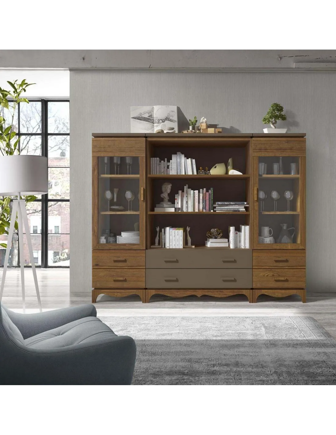 Se compone de varios módulos de estantería y vitrina con los que se pueden hacer composiciones a medida.