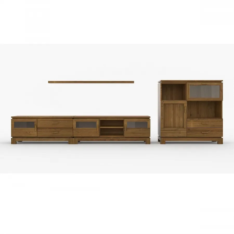 Se compone de varios módulos, los dos bajos de 120 y 150 cm. de largo, el aparador de 120 cm. y el estante de pared de 150 cm. Al ser un mueble totalmente modular se puede adaptar a nuestras necesidades de espacio.