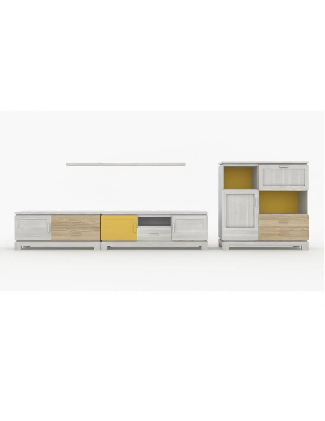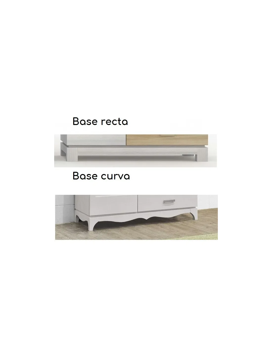 Esta composición de salón contemporánea se puede personalizar primero en su apariencia, pudiendo optar por una base de apoyo a suelo con acabado curvo o recto , lo cual nos da toques de diferencia en el mueble. Además, podrá elegir entre cinco modelos de tirador al mismo precio