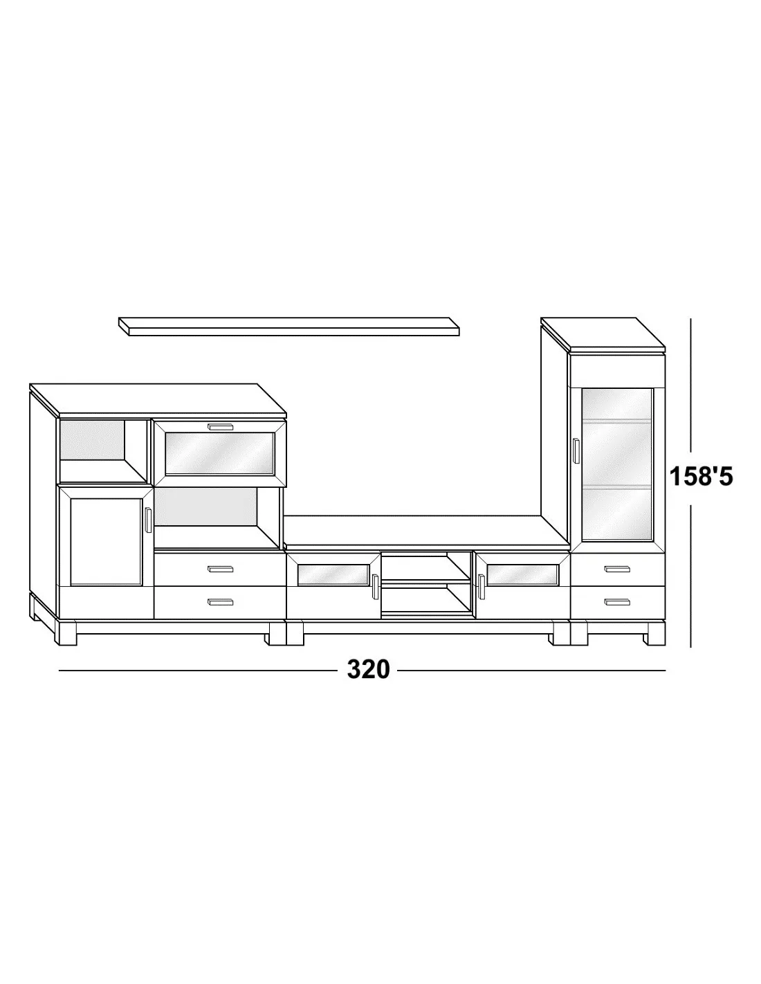 Este mueble de salón 320 se compone de varias piezas con las siguientes medidas (alto x largo x fondo en cm.):
