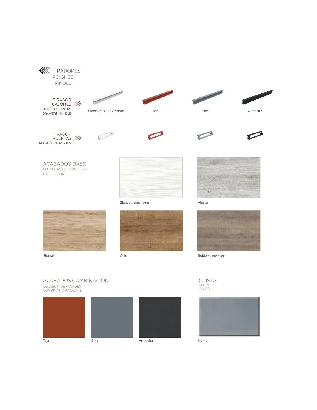 Tenemos opciones de catálogo que no están incluidas en esta ficha de producto pero que se puede optar por configurar a su manera: tiradores, patas, medidas, módulos independientes...
