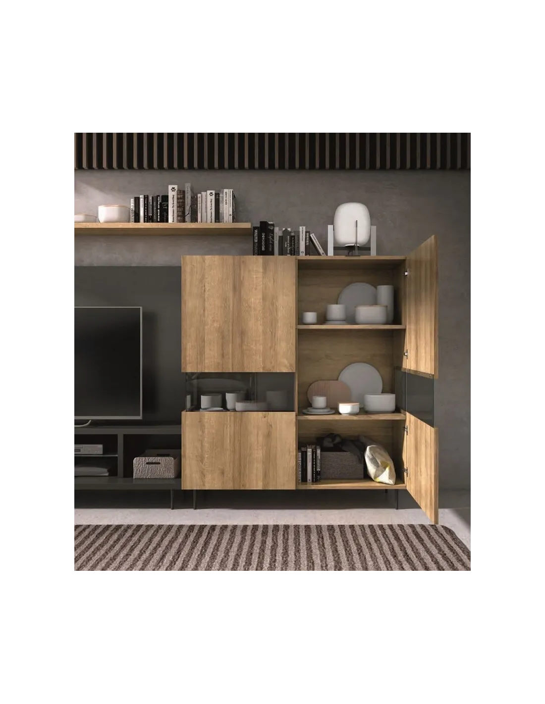 Estos muebles de salón comedor de tendencia tienen la máxima calidad de fabricación, con detenimiento en los detalles, y están fabricados en España cumpliendo la normativa medio ambiental Europea.