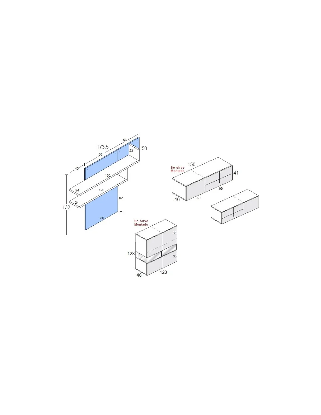 - Estante con trasera vertical: 173.5 x 132 x 24 cm.