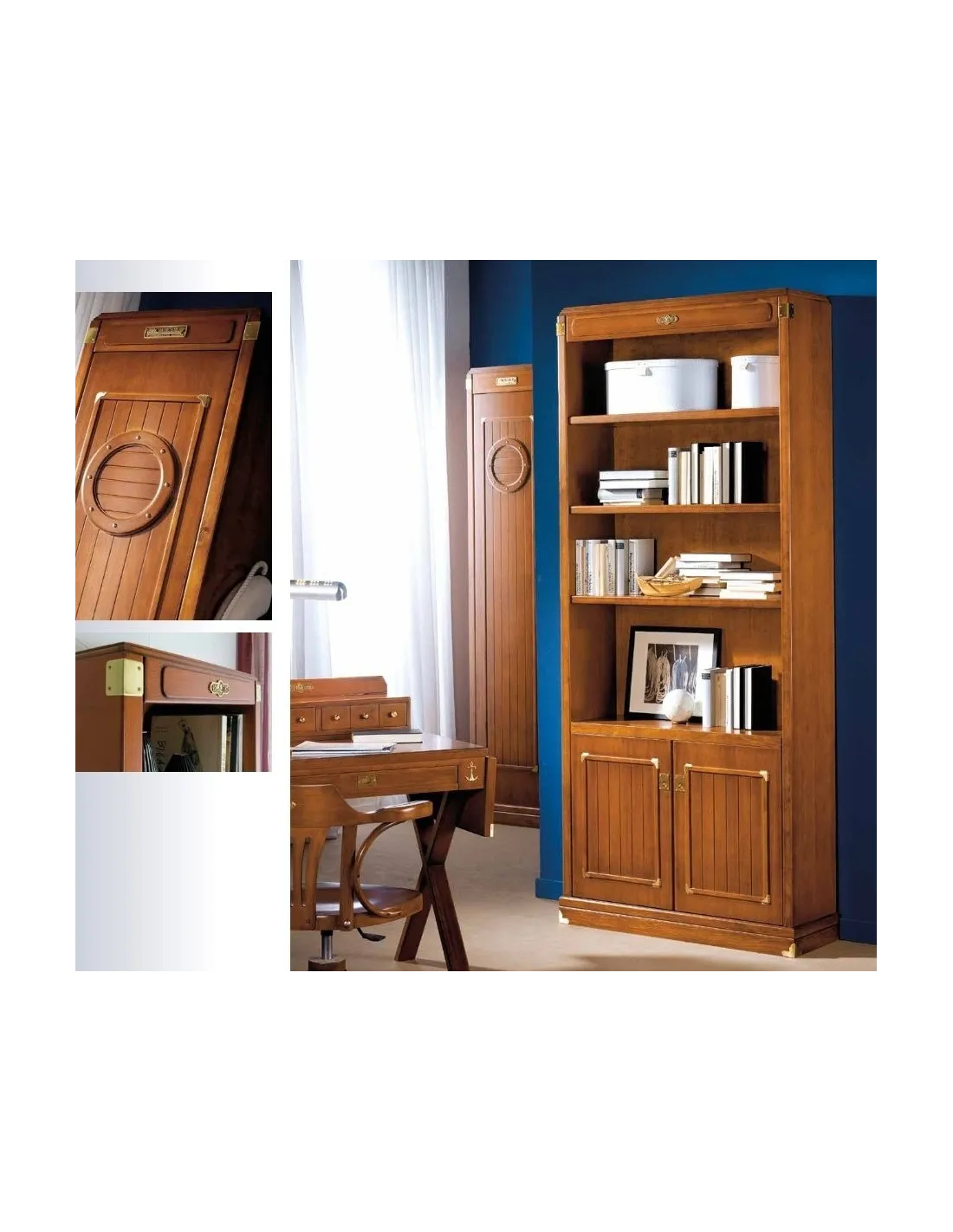 Esta librería madera maciza con puertas tiene unos acabados pulimentados y barnizados de primera calidad, con la posibilidad de elegir entre blanco decapado, nogal claro y nogal naútico, con los detalles del mueble y herrajes de latón pulido.