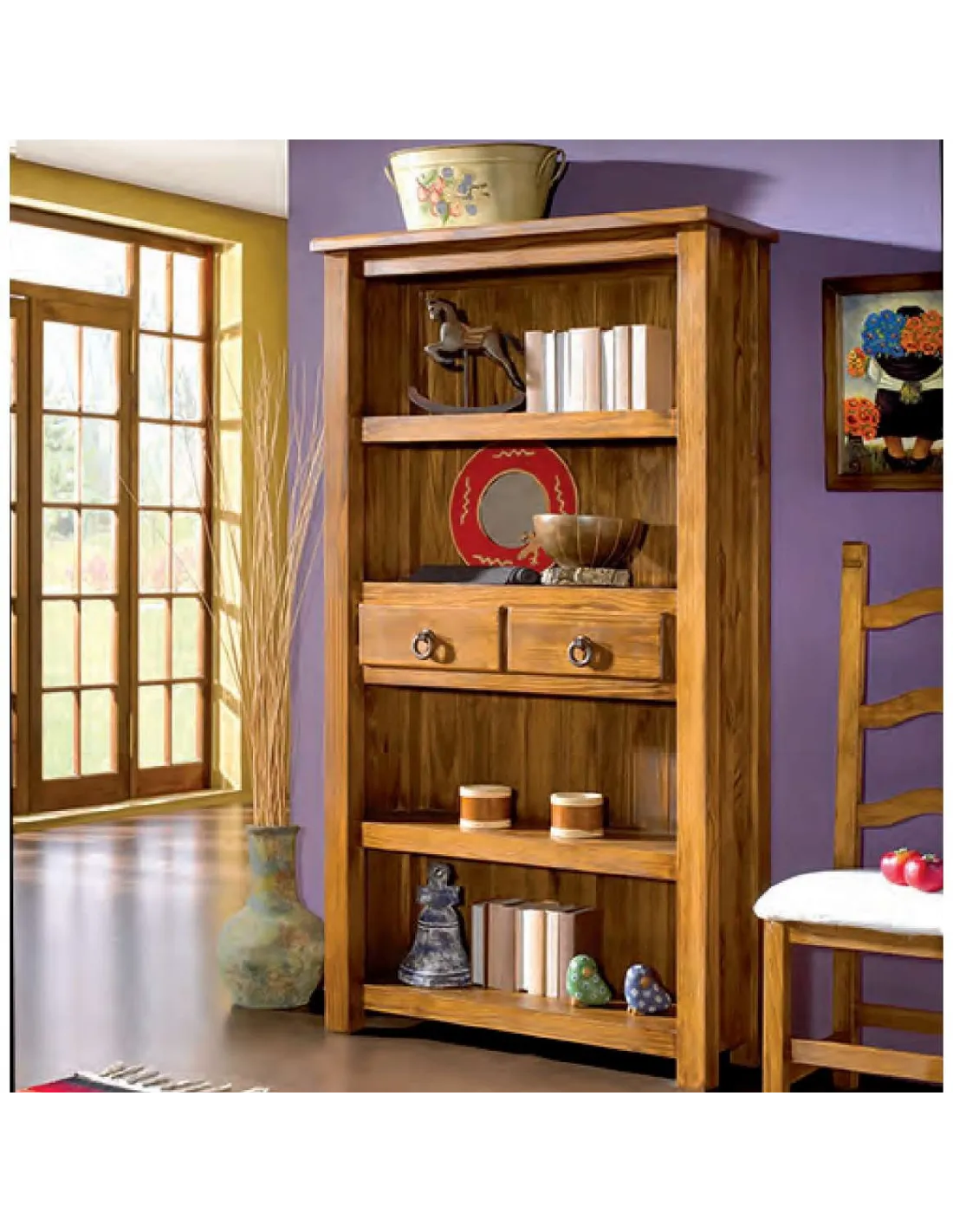 Librero estantería de dos cajones en madera maciza de pino estilo mexicano.