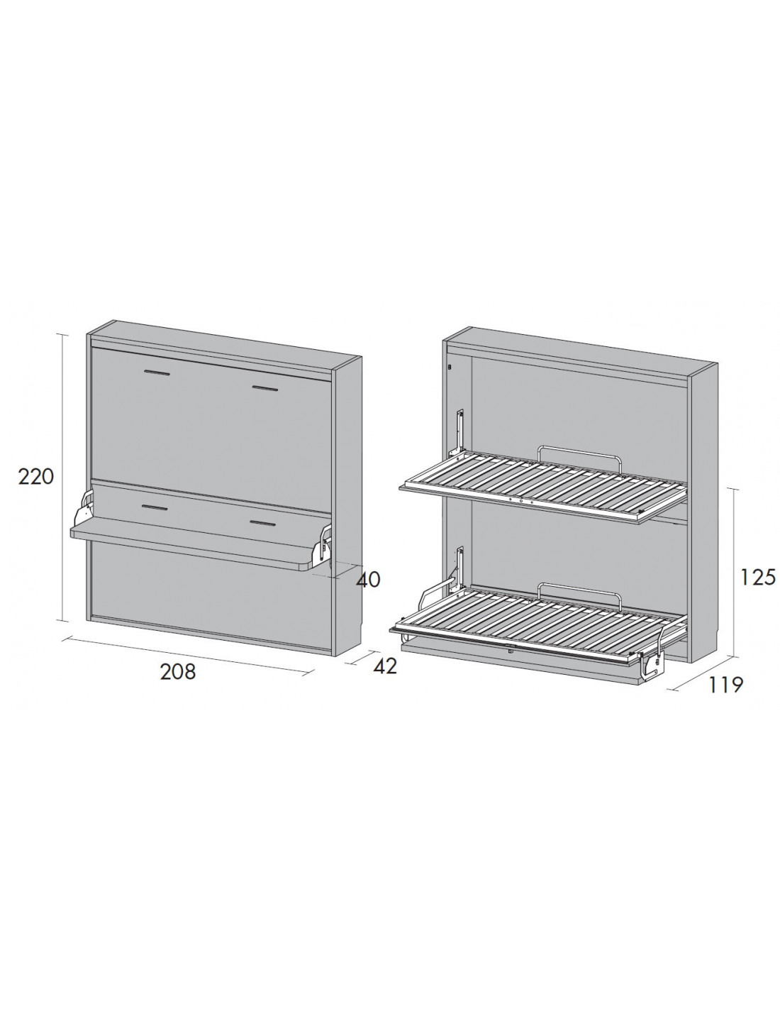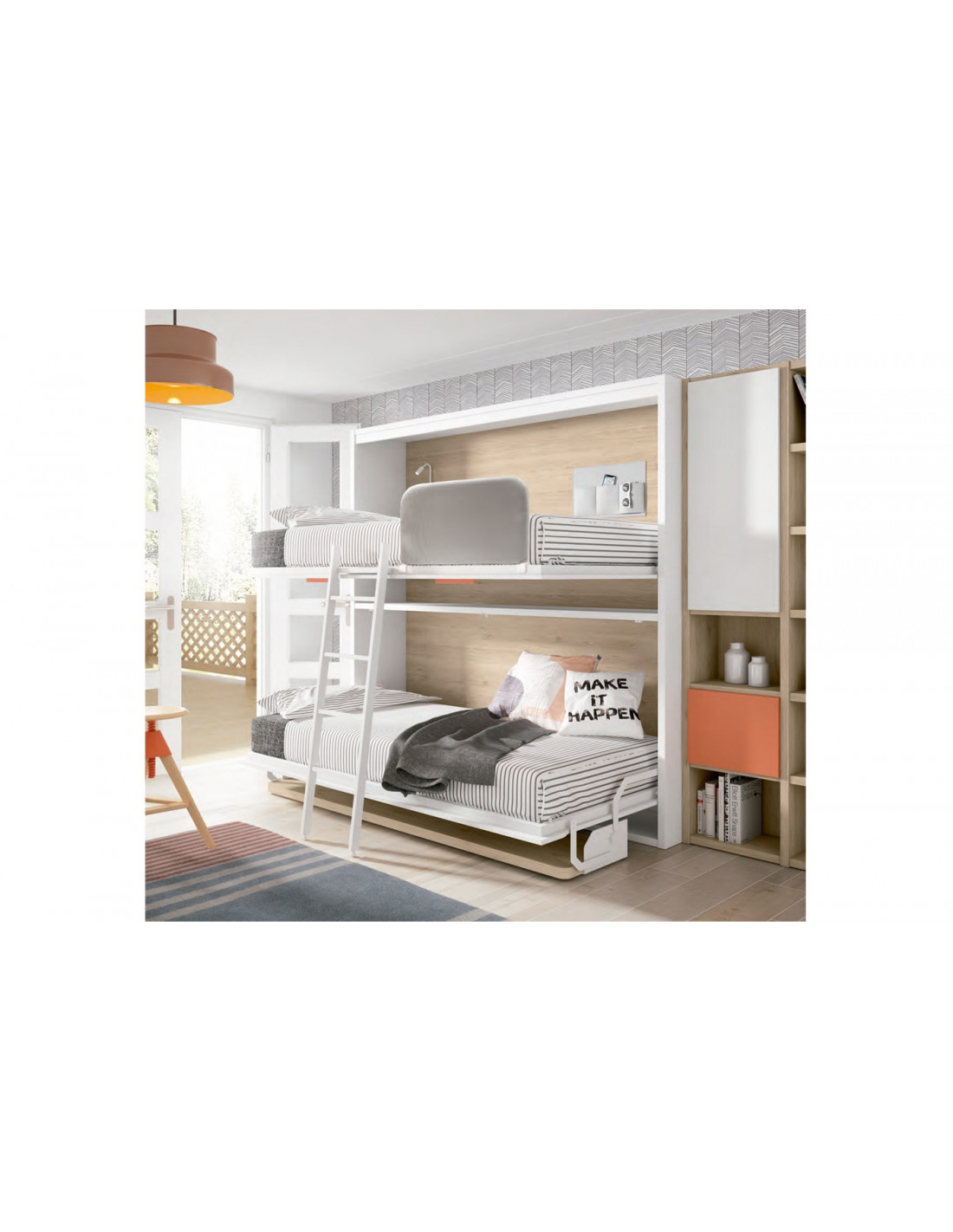 Esta litera abatible de Lan Mobel con apertura automática incluye dos camas abatibles individuales de 90x190 cm. y la escalera de subida a la litera. Está fabricada con los herrajes de calidad y tablero Beladur® de alta gama.