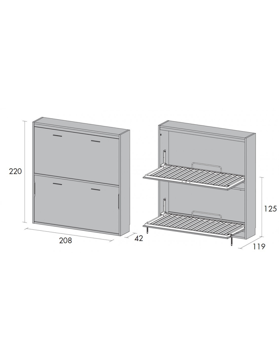 Esta litera abatible de Lan Mobel con apertura automática incluye dos camas abatibles individuales de 90x190 cm. y la escalera de subida a la litera. Las medidas totales son:
