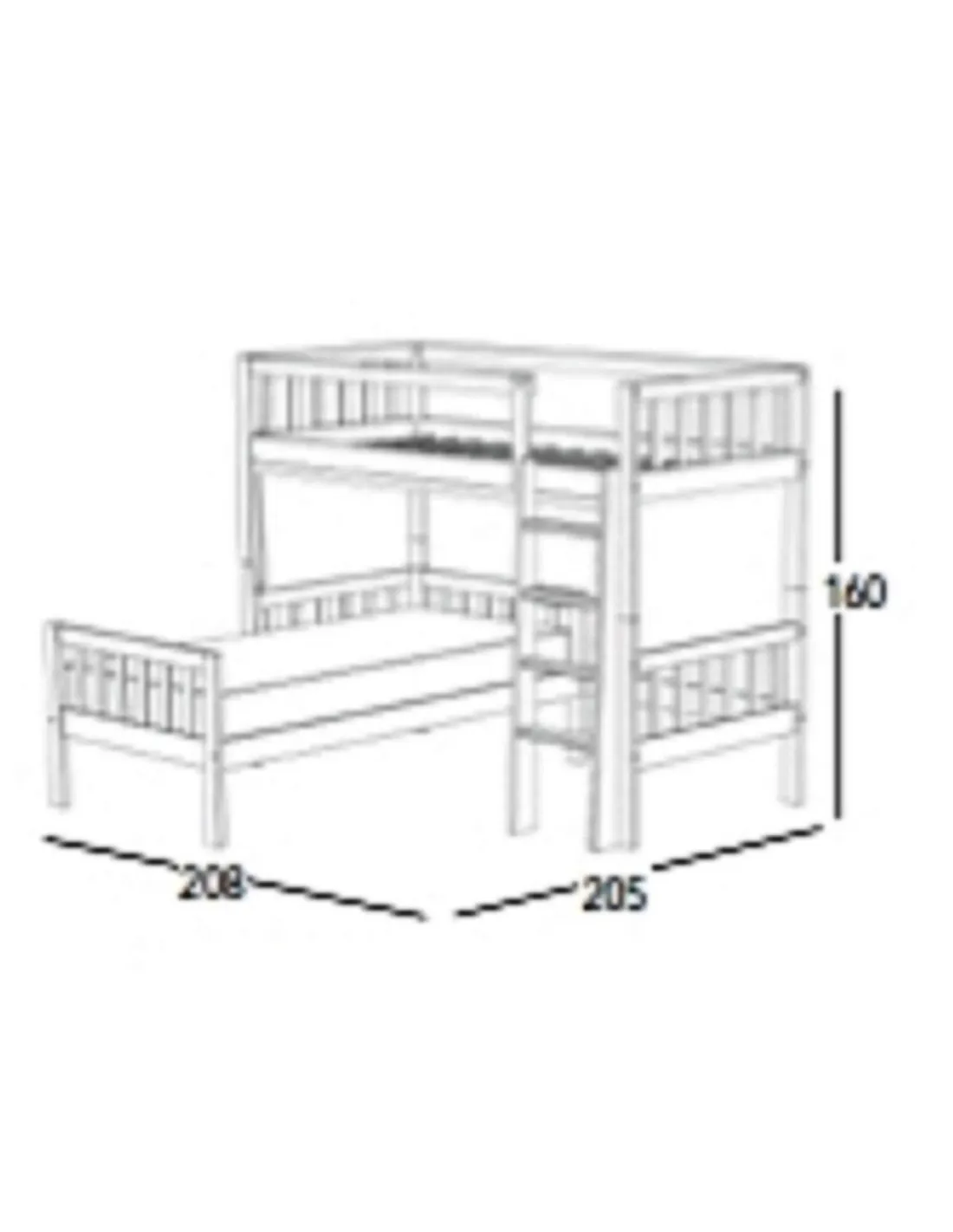 Esta litera Zendaya convertible Barras está compuesta por una cama alta con escalera y una cama baja independiente. Vienen disponibles para colchones de largo variable (180 / 190 / 200 cm.) y de ancho variable (para anchos de 80 / 90 / 105 cm.), y tienen las siguientes medidas totales en cm.:
