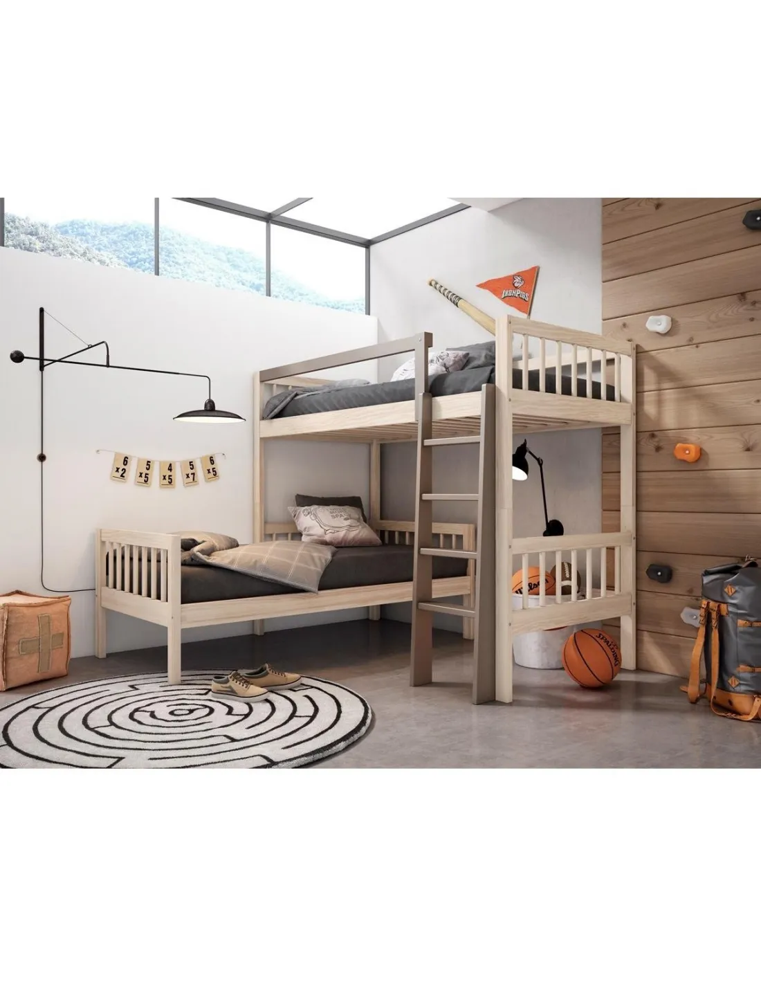 Esta litera convertible Palillos en ele SE PUEDE CONVERTIR EN DOS CAMAS IGUALES E INDEPENDIENTES. está compuesta por una cama alta con escalera y una cama baja independiente. Vienen disponibles para colchones de largo variable (180 / 190 / 200 cm.) y de ancho variable (para anchos de 80 / 90 / 105 cm.), y tienen las siguientes medidas totales en cm.: