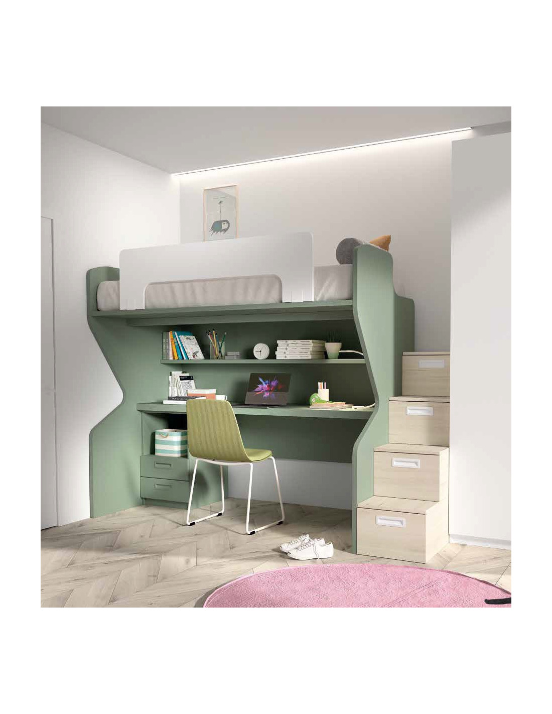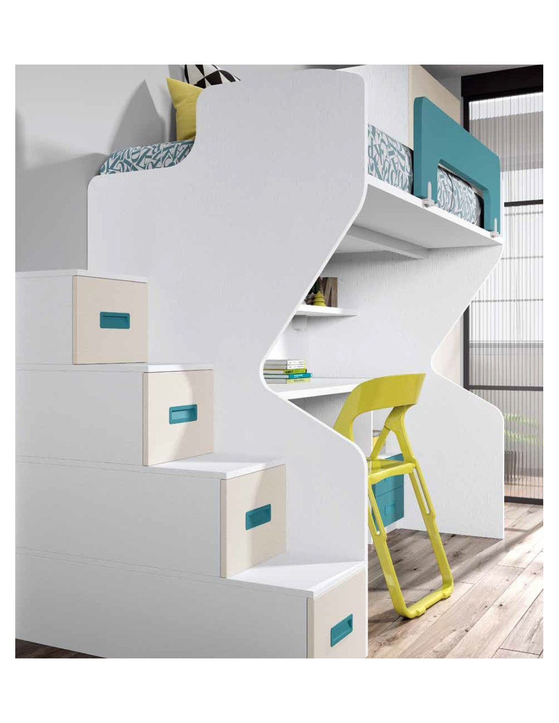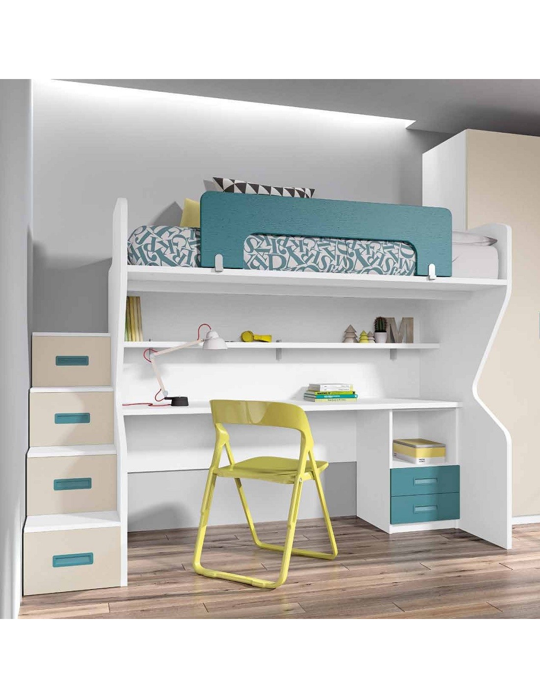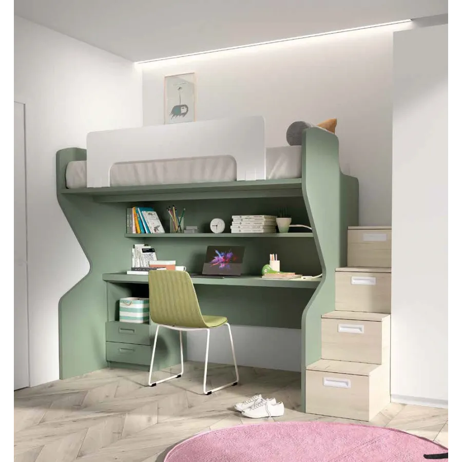 Litera con escritorio y escalera de cajones con estanterías