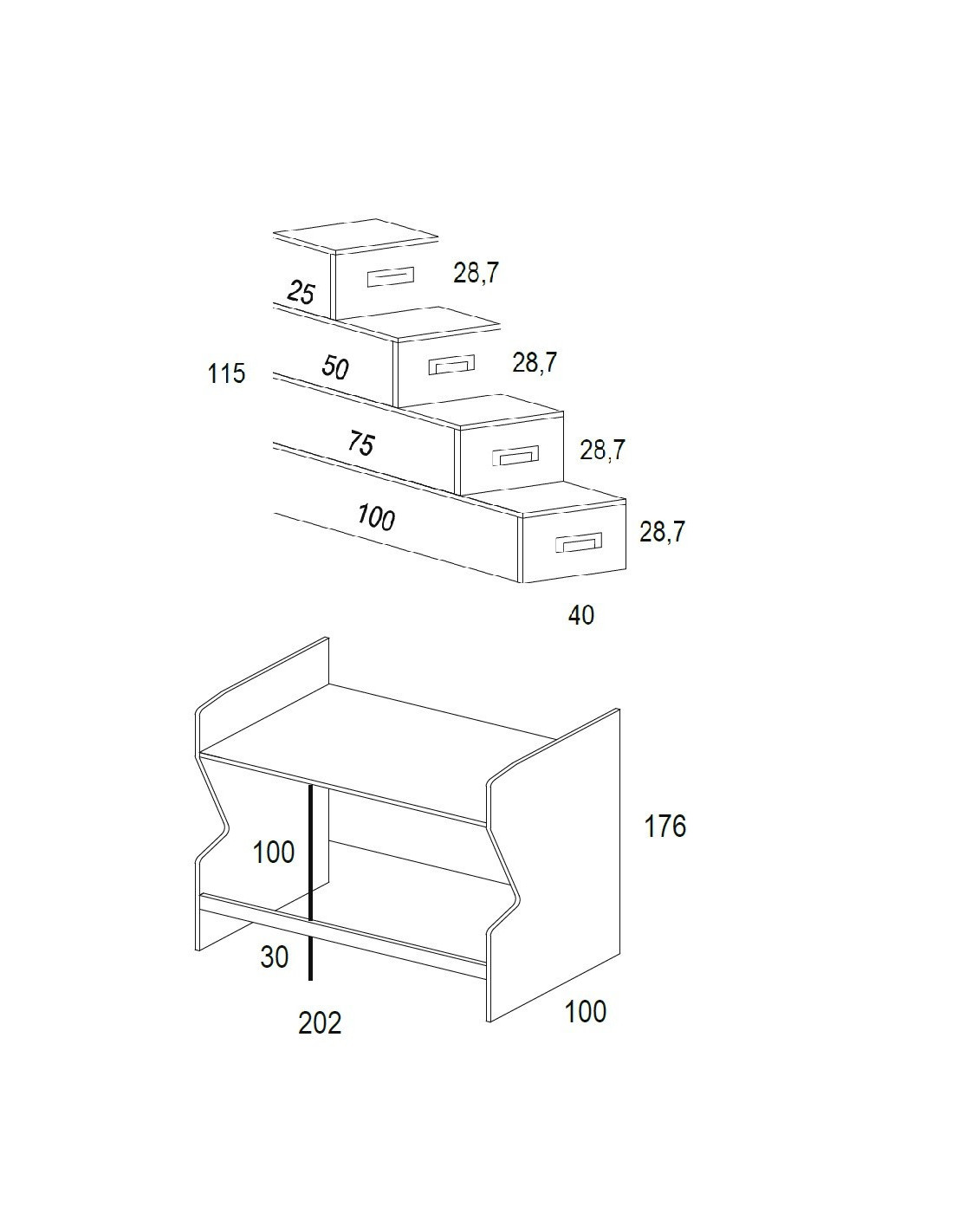 - Módulos de cajones de gran capacidad: los módulos de la escalera son independientes, cuatro con medida de ancho 40 cm. y de alto 28,7 cm., y unos fondos de 25 / 50 / 75 / 100 cm. El más pequeño es una puerta.