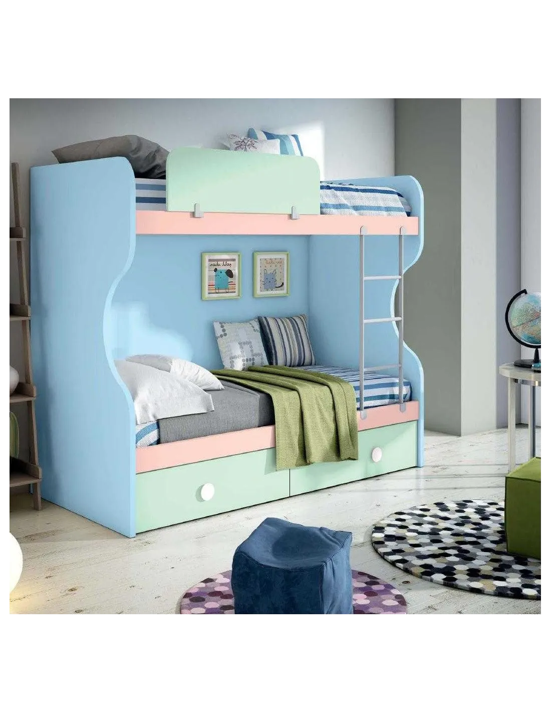 Litera juvenil de fabricación española hecha en melamina de primera calidad con tablero melamínico de primera calidad resistente a ralladuras y manchas, según normativa vigente. Tablero de 30 mm. de grosor canteado en PVC de 1 mm. de grosor y herrajes de primera calidad.