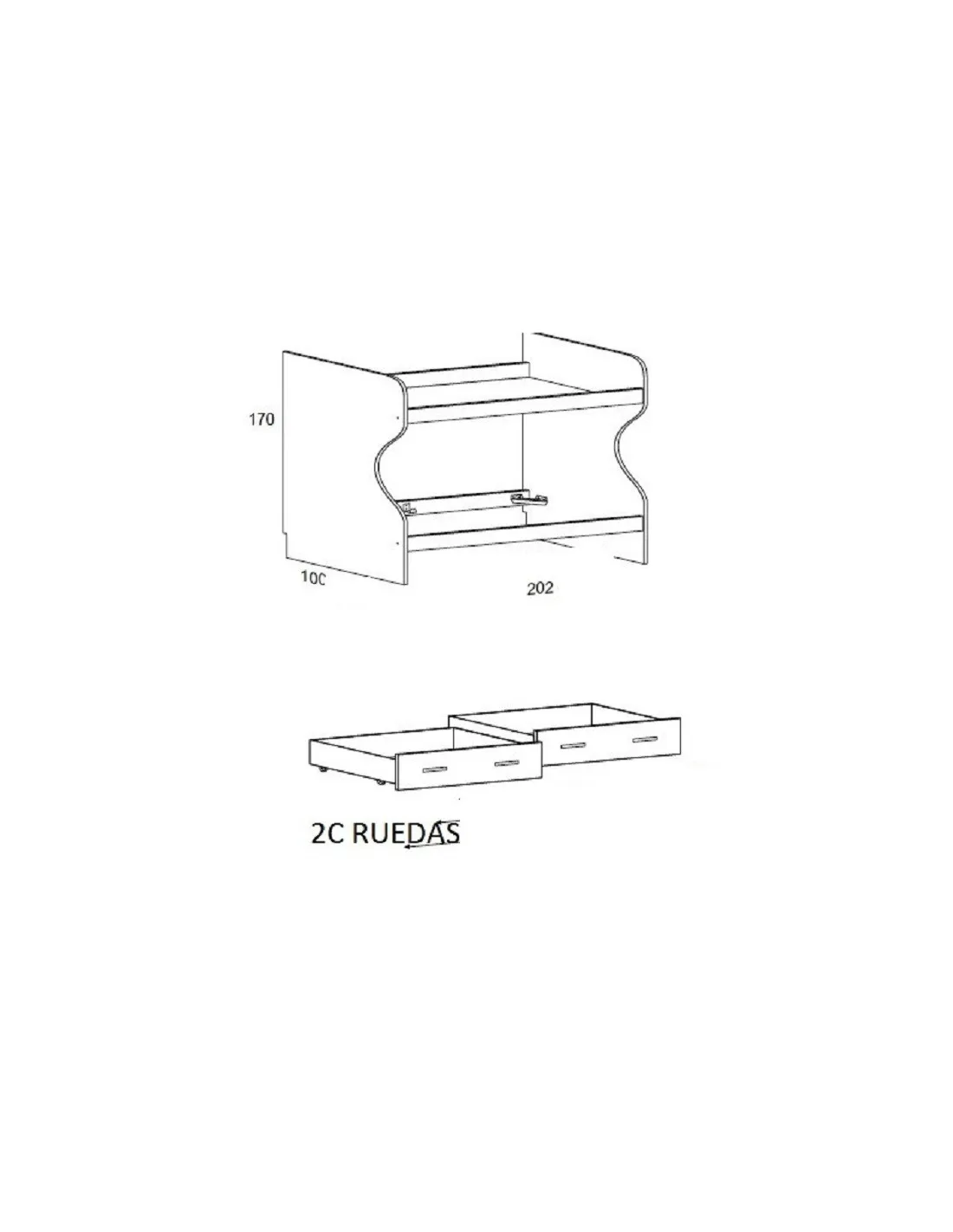 - DOS CAJONES CON RUEDAS para la parte inferior (se puede optar por un único cajón con ruedas que ocuparía toda la base de la litera). Los cajones miden 25 cm. de alto, tienen gran capacidad y ruedas para poder desplazarlos cómodamente por el suelo;