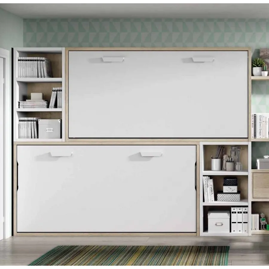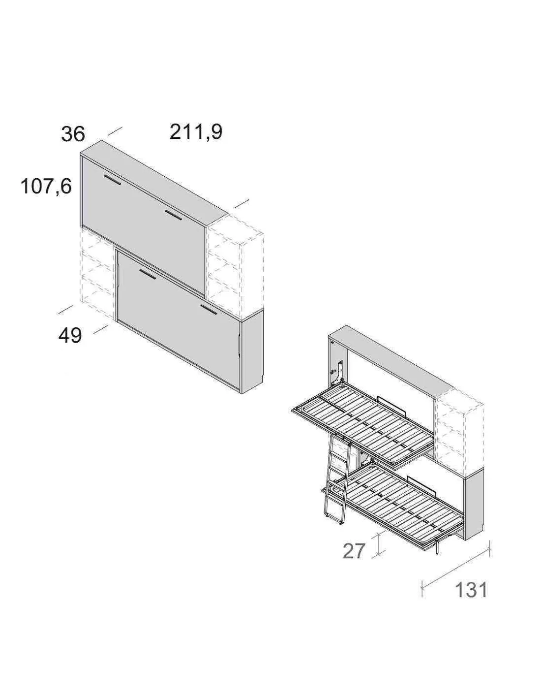 Esta cama abatible incluye dos camas abatibles individuales, la escalerilla de subida y las estanterías laterales. Se puede montar todo junto o disponer de cada una de las camas abatibles por separado.