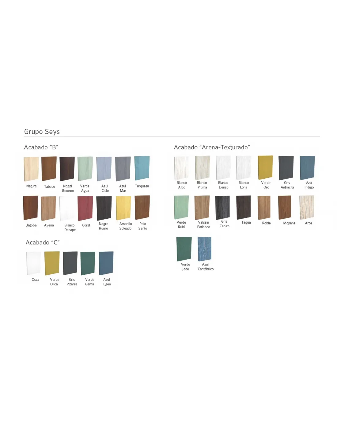 Siempre a la vanguardia, Grupo Seys pone a su disposición una amplia paleta de colores y acabados de tendencia que complementan al diseño. Por definición, estos muebles se encargan en color único, pero nos permite combinar dos o más colores en el mismo mueble. Si está interesado en combinar acabados, póngase en contacto con la tienda.
