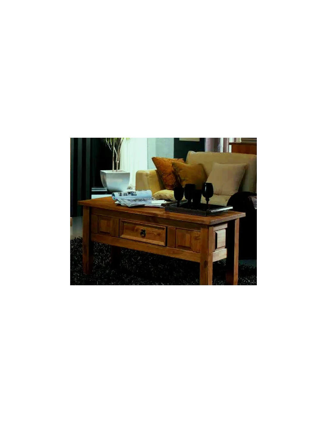 Esta mesa de centro colonial tiene un diseño inspirado en los muebles de estilo rústico. Fabricado en madera maciza de pino con acabado a la cera de color oscuro. Combinada con herrajes y tiradores de forja negra.