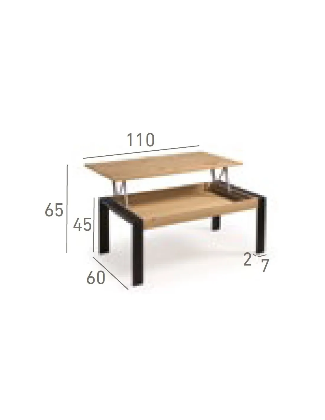 La mesa de centro elevable Tema viene disponibles en medida 110x60 cm., con una altura de 45 cm. elevable hasta los 65.