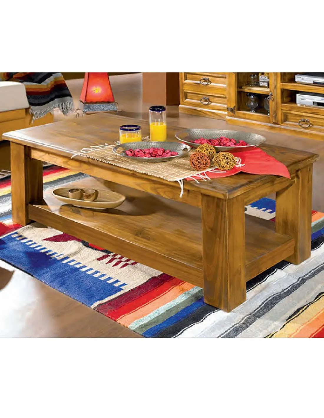 Mesa de centro de diseño rústico con revistero en madera maciza de pino estilo mexicano.