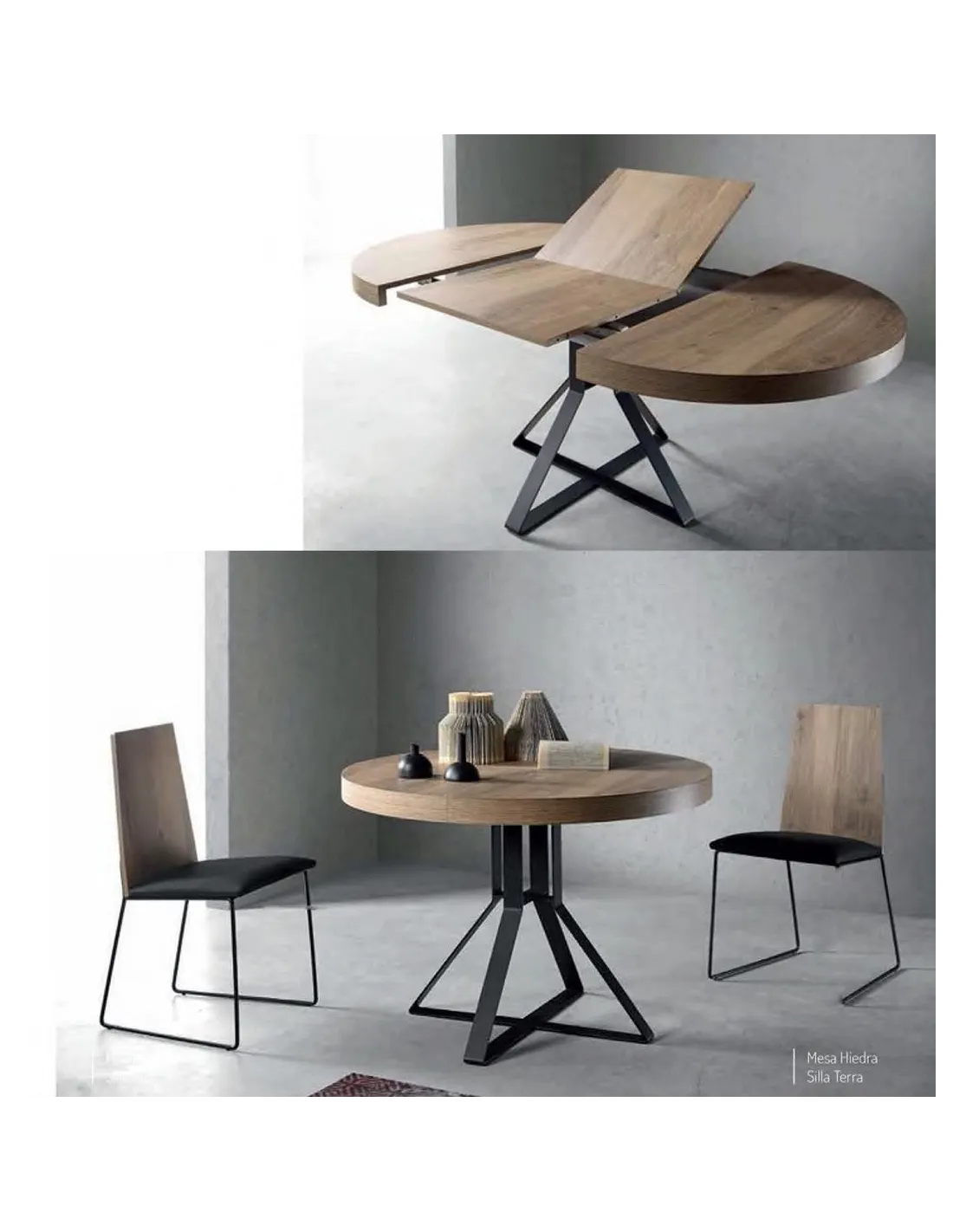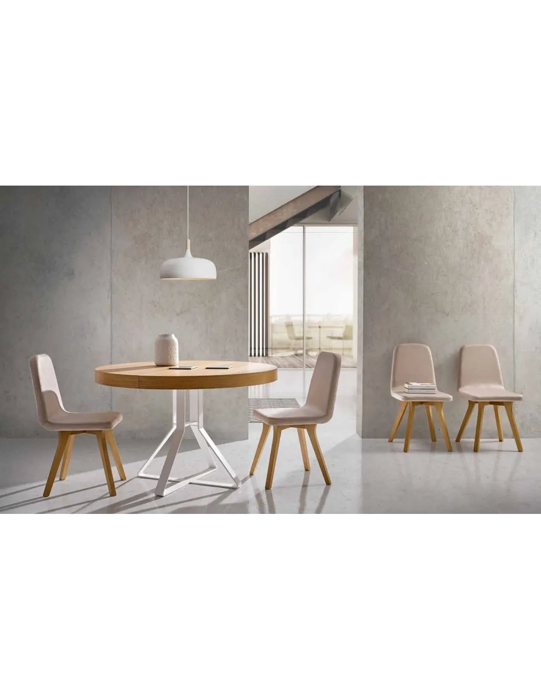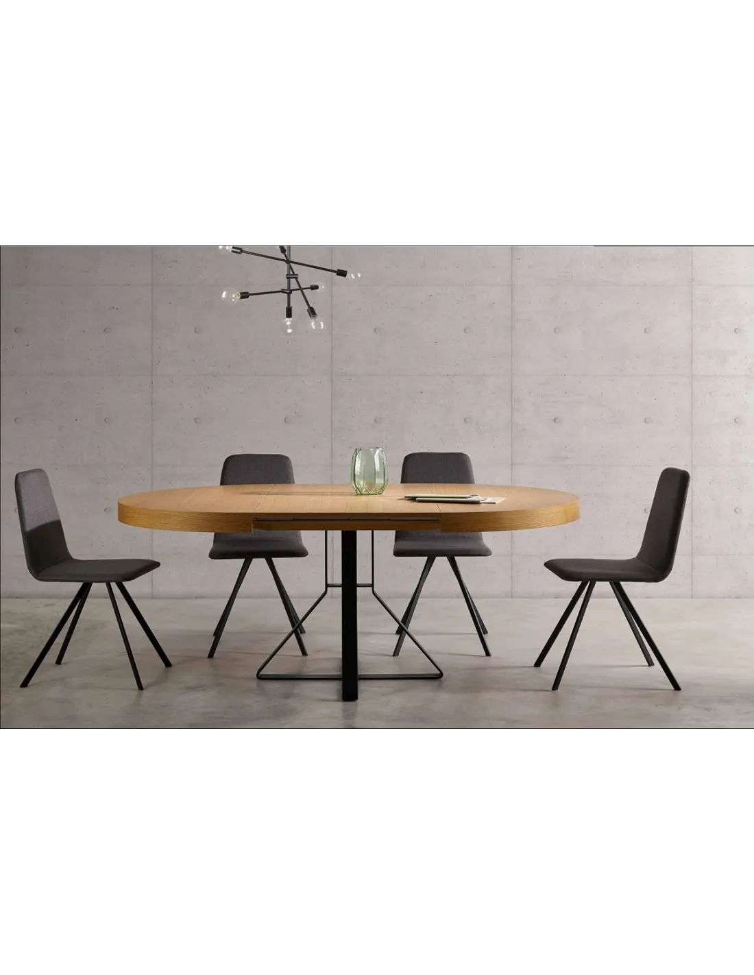 La mesa extensible Milo cuenta con medida cerrada de diámetro 105 cm., que con el mecanismo extensible suman 70 cm. quedándose mesas abiertas de 175 cm.