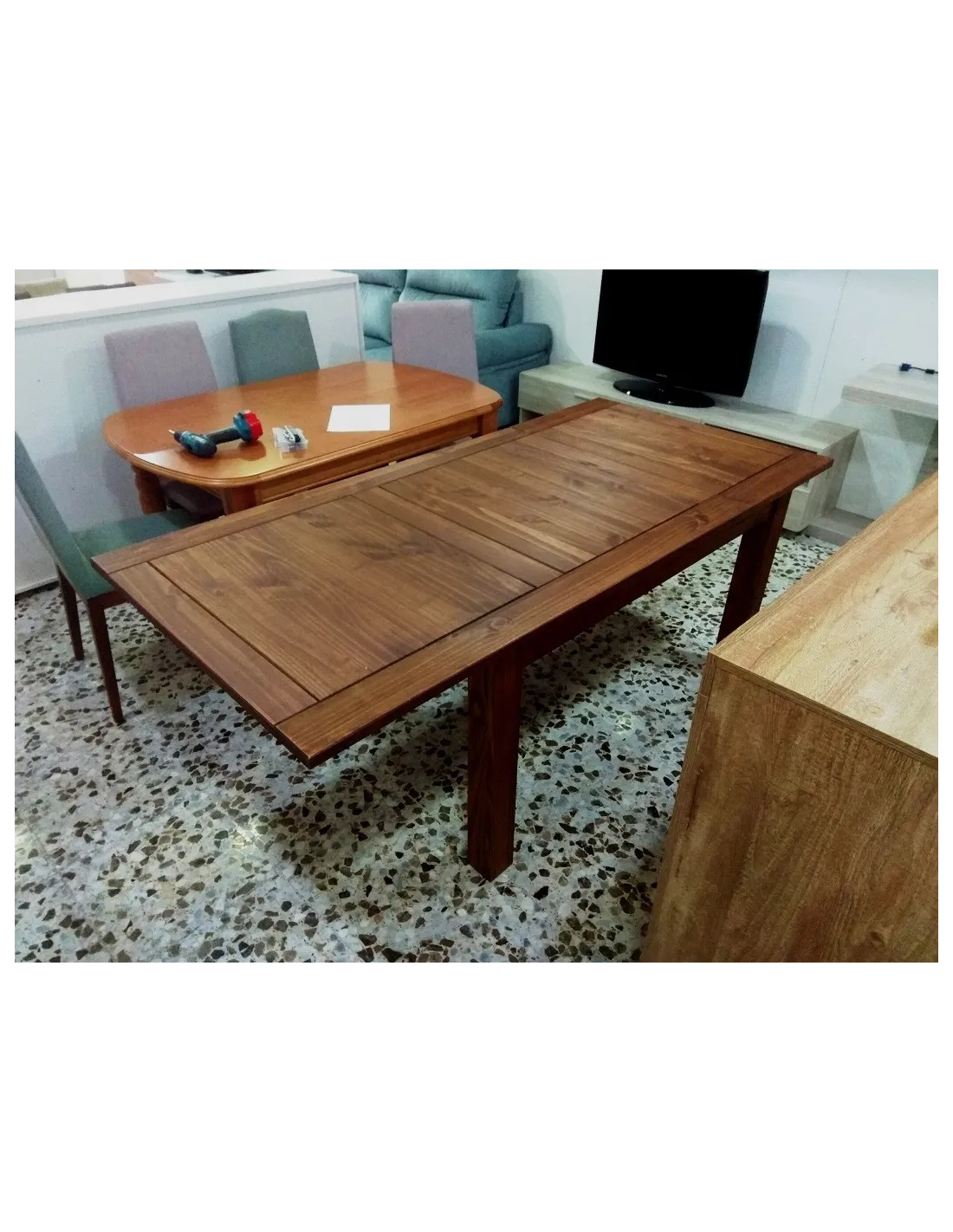 Mesa de comedor extensible de diseño colonial en madera maciza de pino color nogal oscuro encerado en formato kit