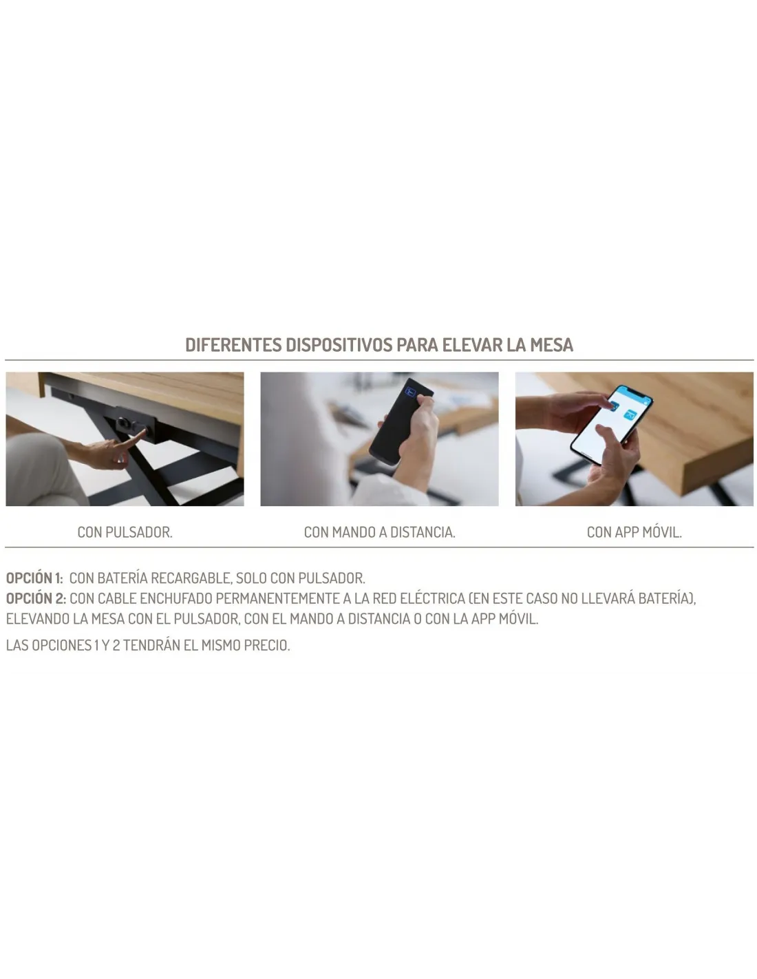 Esta mesa a motor puede personalizarse en cientos de combinaciones combinando su mecanismo de elevaci´´on con los acabados disponibles para las patas y la tapa superior. Para configurar su mesa debe elegir: