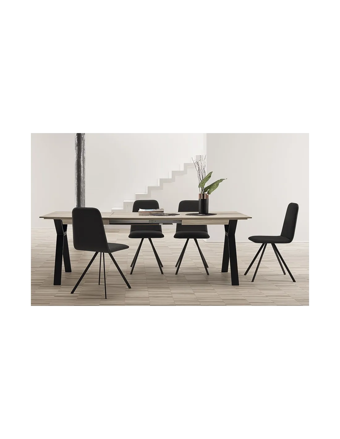 La mesa Elsa Melamina con doble extensible cuenta con varias medidas de largo que aumentan 40+40 cm. independientes gracias a su mecanismo extensible manual con guía telescópica, donde sus resistentes patas metálicas se deslizan sobre el suelo para dar cabida en su centro a dos tramos independientes de 40 cm. cada uno.