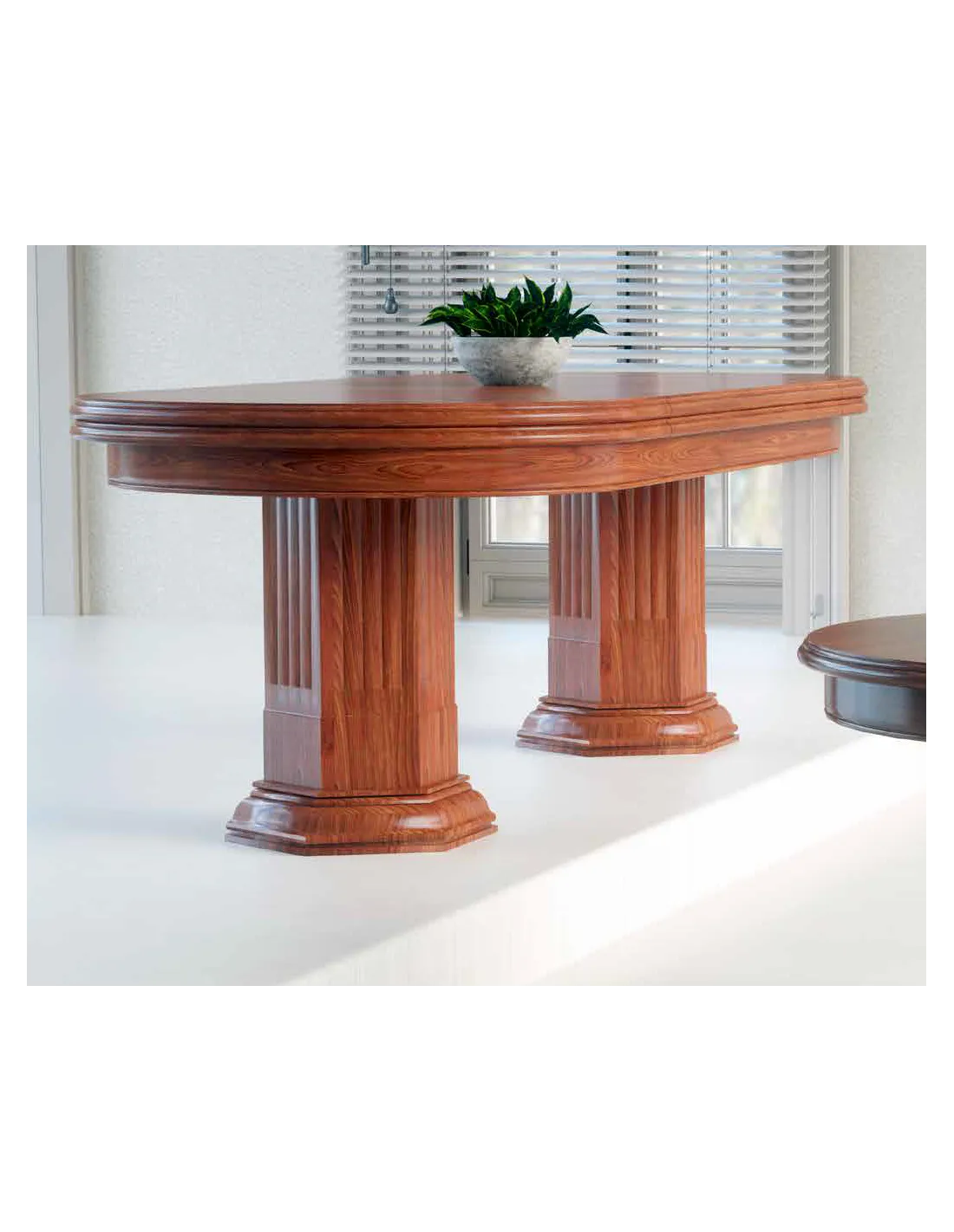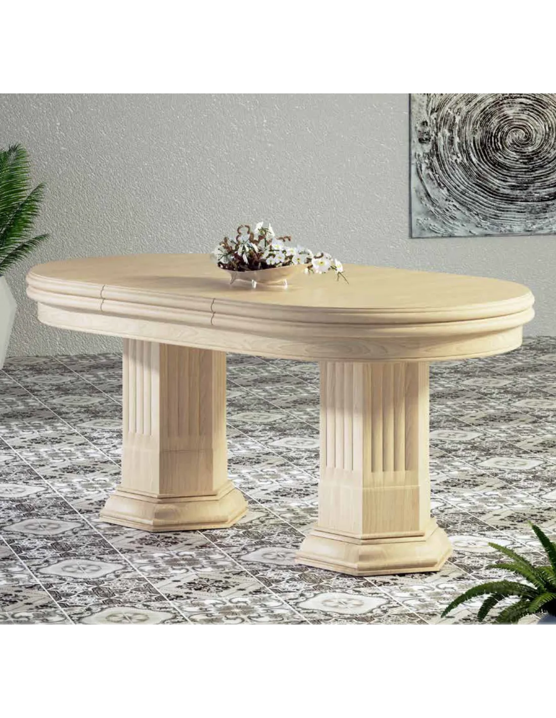 Mesa de comedor de diseño clásico con apertura extensible que tapa tipo petaca y patas tipo columna. Su personalización tanto de medidas como de acabados nos permite integrarla en cualquier ambiente en el que se quiera disponer de una mesa de gran presencia.