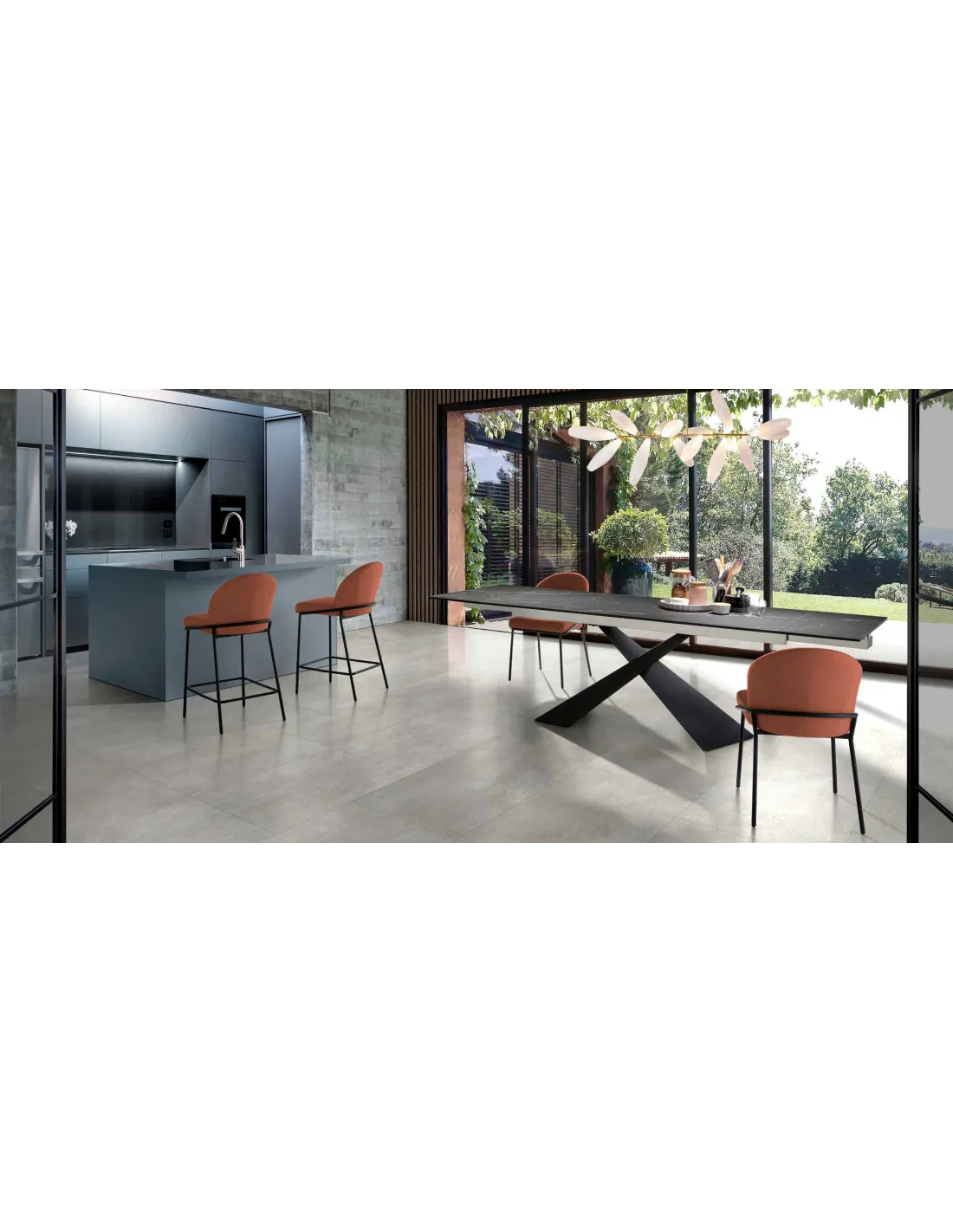 Sobre porcelánico. Acabado porcelánico de alta calidad con 15 mm. de espesor fabricados de una sola cocción, con muy bajo ratio de absorción de agua y humedad, son compactos, antideslizante y muy resistentes, se adaptan a los cambios bruscos de temperatura sin ningún problema y son hipoalergénicos, ya que no retienen sustancias orgánicas y bacterias en su superficie. Todas las mesas extensibles que cuentan con tapa porcelánica llevan un cristal inferior de las mismas dimensiones para aportar firmeza al diseño. El grosor de la mesa se compone de 3mm de porcelánico + 12mm de cristal.