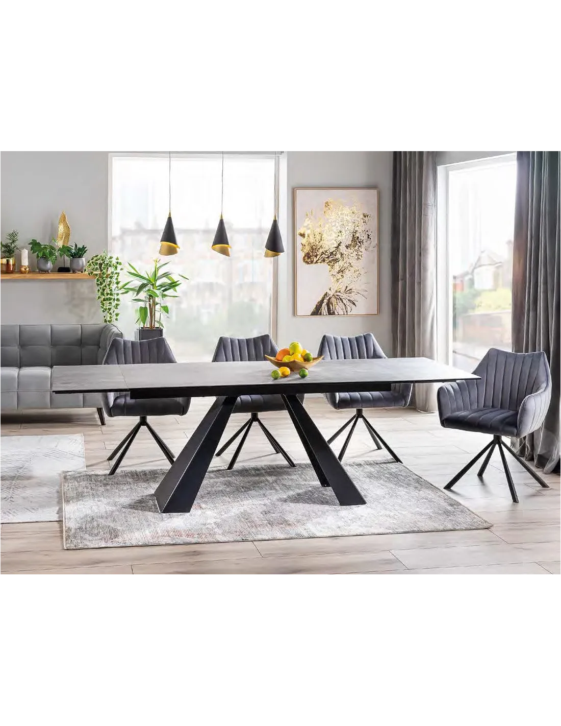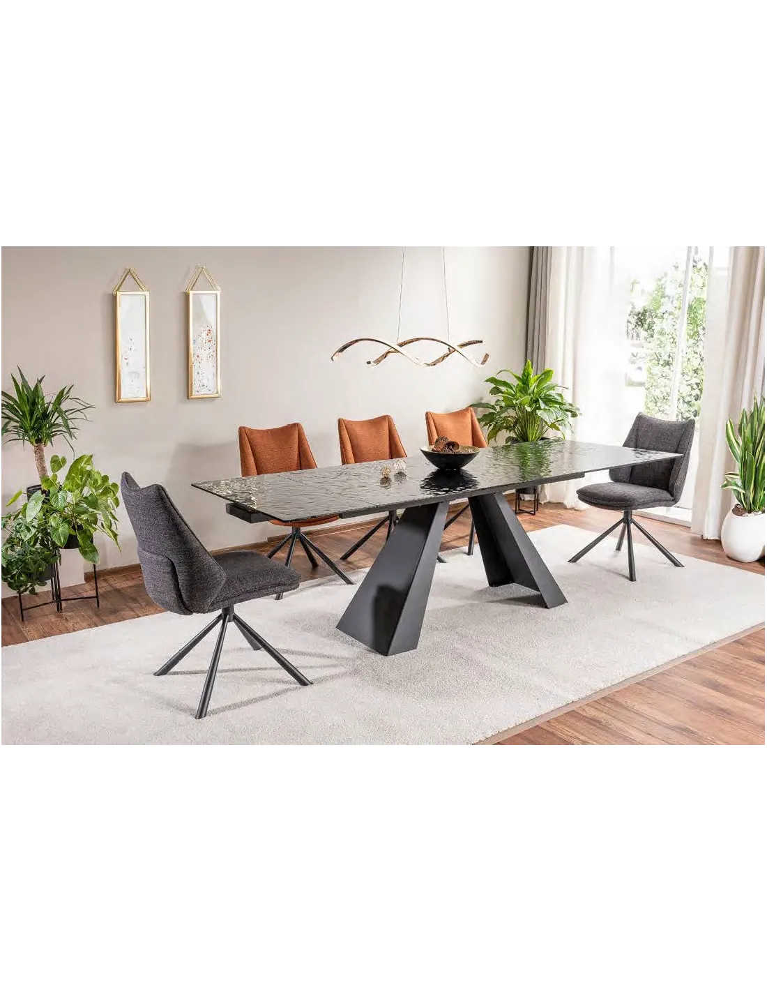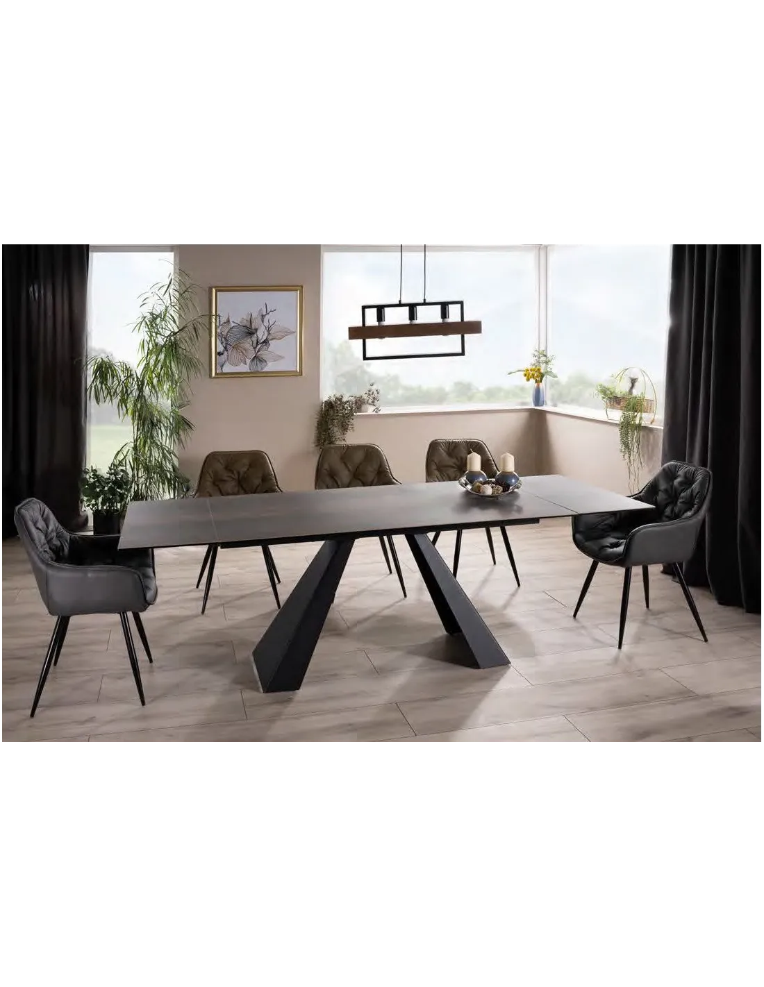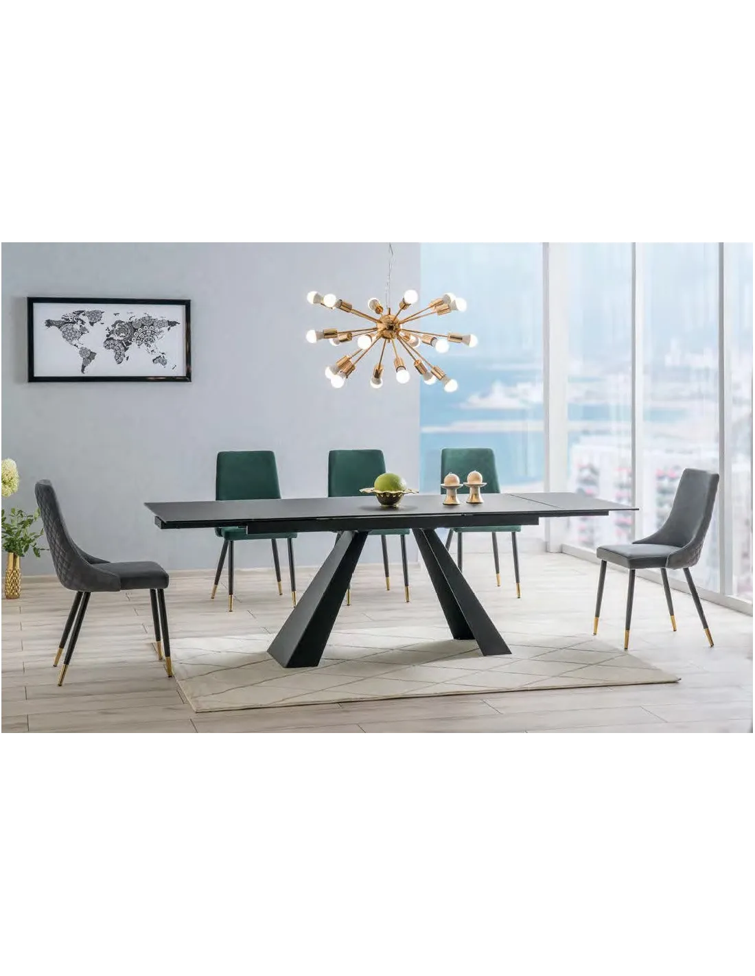 Mesa de comedor extensible realizada la tapa en vidrio templado y tapa porcelánica modelo Eliot extensible keramik con estructura en color negro mate