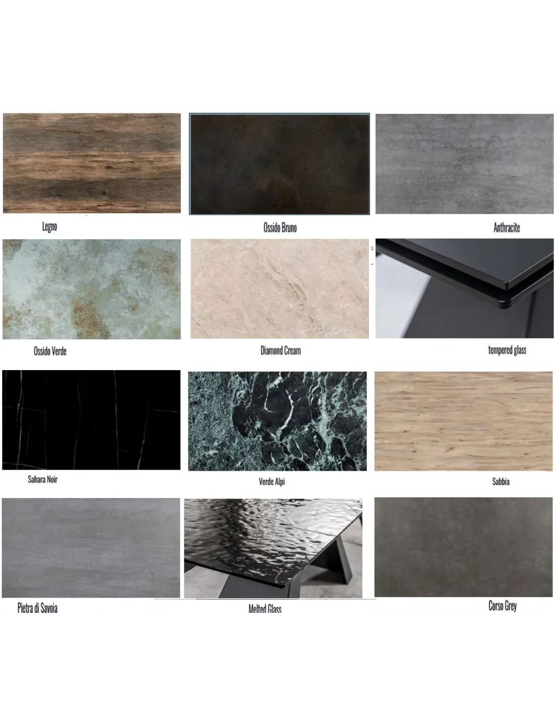 Pie metálico siempre en negro y tapa porcelánica montada sobre cristal templado, tal y como aparece en las imágenes. Los acabados porcelánicos disponibles son: Anthracite, Corso Grey, Legno, Ossido Verde, Ossido Bruno, Diamond cream, Pietra di Savoia, Sabbia, Sahara noir y Verde alpi. Adicionalmente se puede proveer con la tapa de cristal templado o la de cristal fundido (preguntar a tienda).